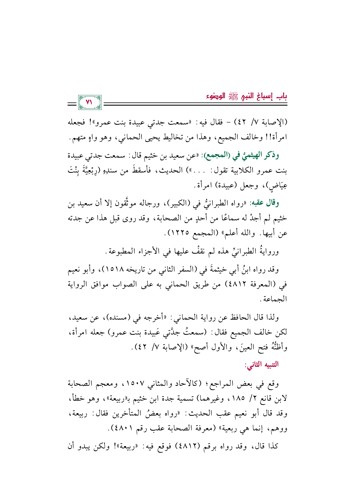 وذكر الهيثميُّ في (المجمع): "عن سعيد بن خثيم قال: سمعت جدتي عبيدة بنت عمرو الكلابية تقول: ... " الحديث، فأسقطَ من سندِهِ (رِبْعِيَّةَ بِنْتَ عِيَاضٍ)، وجعل (عبيدة) امرأة.