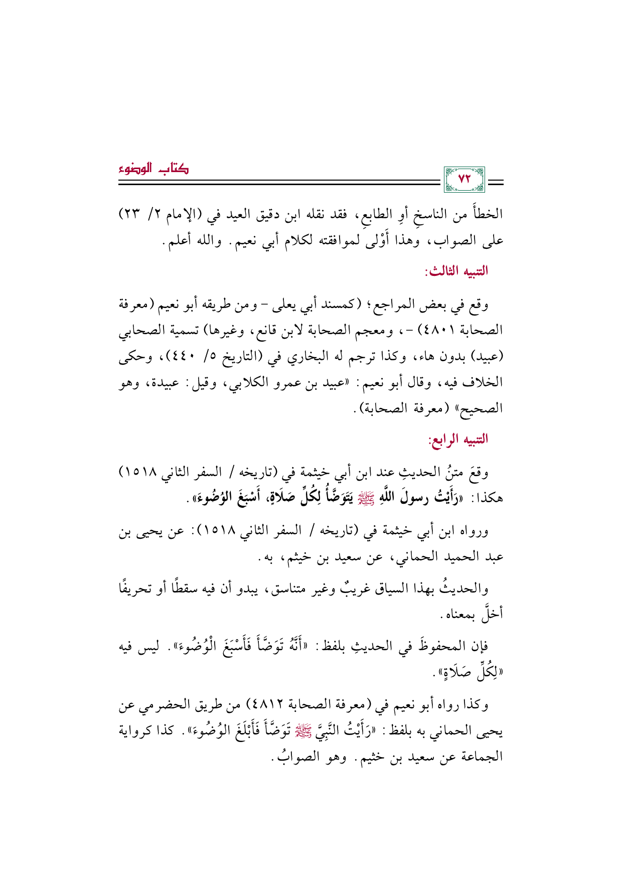 وكذا رواه أبو نعيم في (معرفة الصحابة ٤٨١٢) من طريق الحضرمي عن يحيى الحماني به بلفظ: ((رَأَيْتُ النَّبِيَّ صلى الله عليه وسلم تَوَضَّأَ فَأَبْلَغَ الوُضُوءَ)). كذا كرواية الجماعة عن سعيد بن خثيم. وهو الصوابُ.