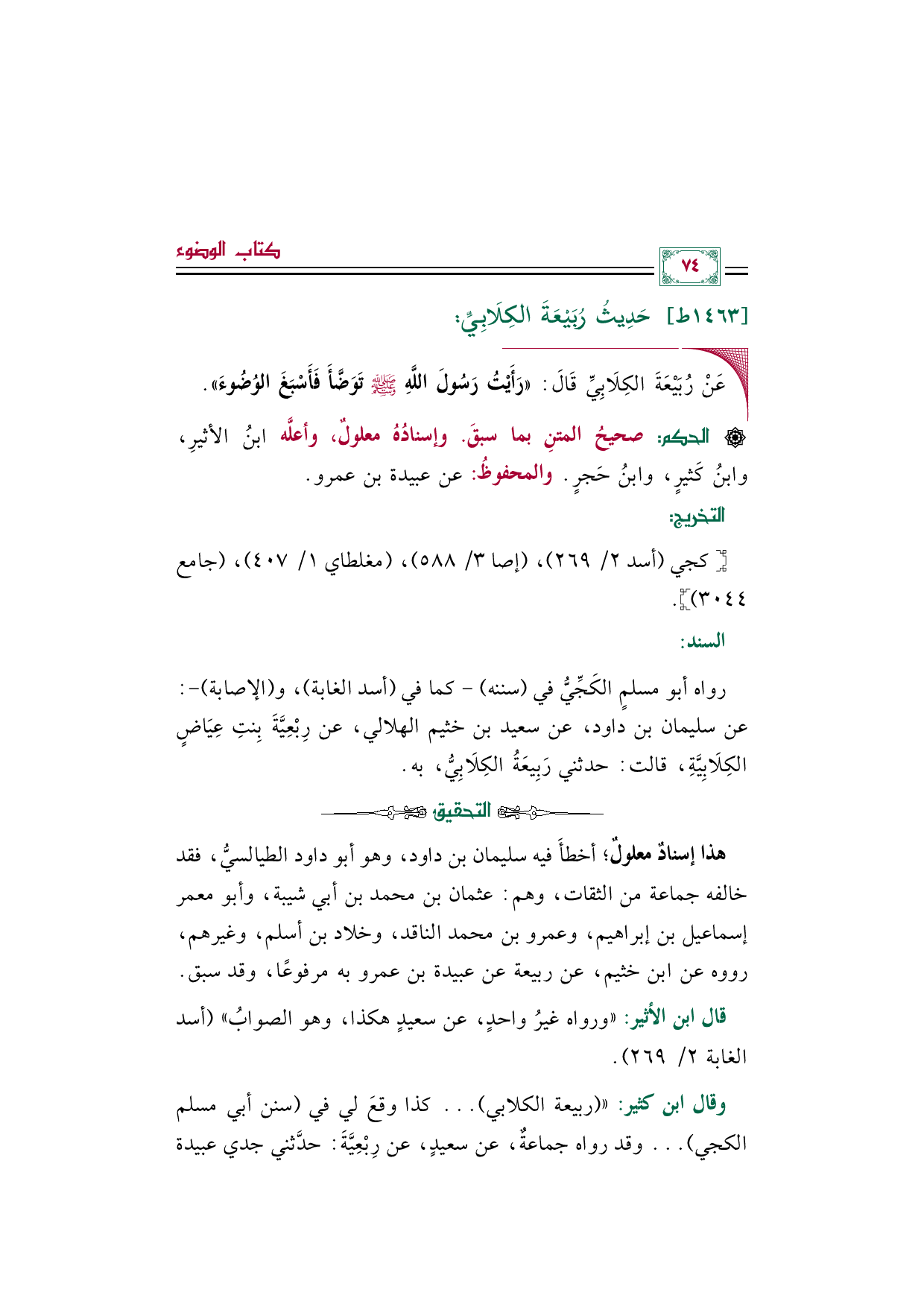◼ عَنْ رُبَيْعَةَ الكِلَابِيِّ قَالَ: ((رَأَيْتُ رَسُولَ اللَّهِ صلى الله عليه وسلم تَوَضَّأَ فَأَسْبَغَ الوُضُوءَ)).