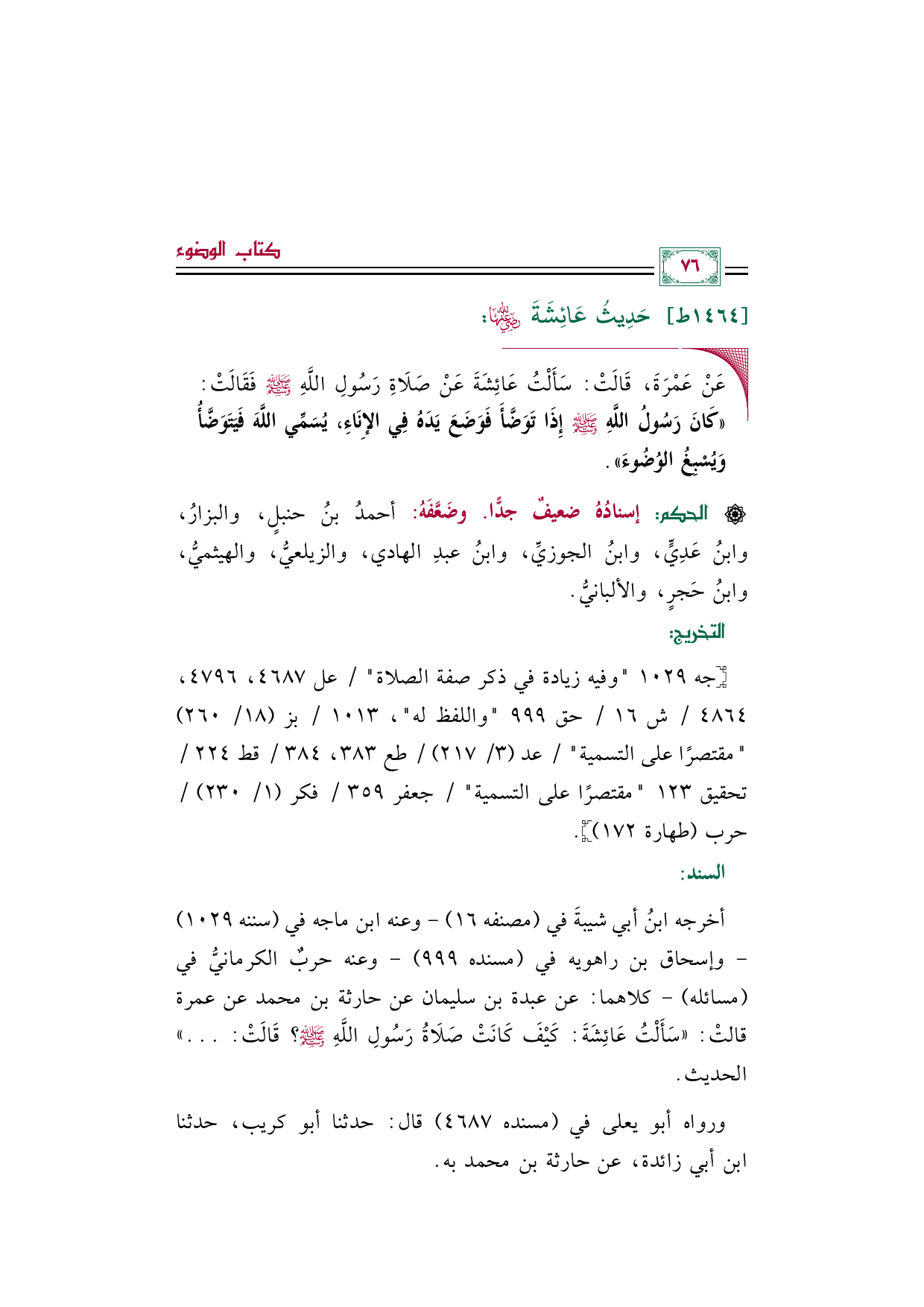 ◼ عَنْ عَمْرَةَ، قَالَتْ: سَأَلْتُ عَائِشَةَ عَنْ صَلَاةِ رَسُولِ اللَّهِ صلى الله عليه وسلم فَقَالَتْ: «كَانَ رَسُولُ اللَّهِ صلى الله عليه وسلم إِذَا تَوَضَّأَ فَوَضَعَ يَدَهُ فِي الإِنَاءِ، يُسَمِّي اللَّهَ فَيَتَوَضَّأُ وَيُسْبِغُ الوُضُوءَ».