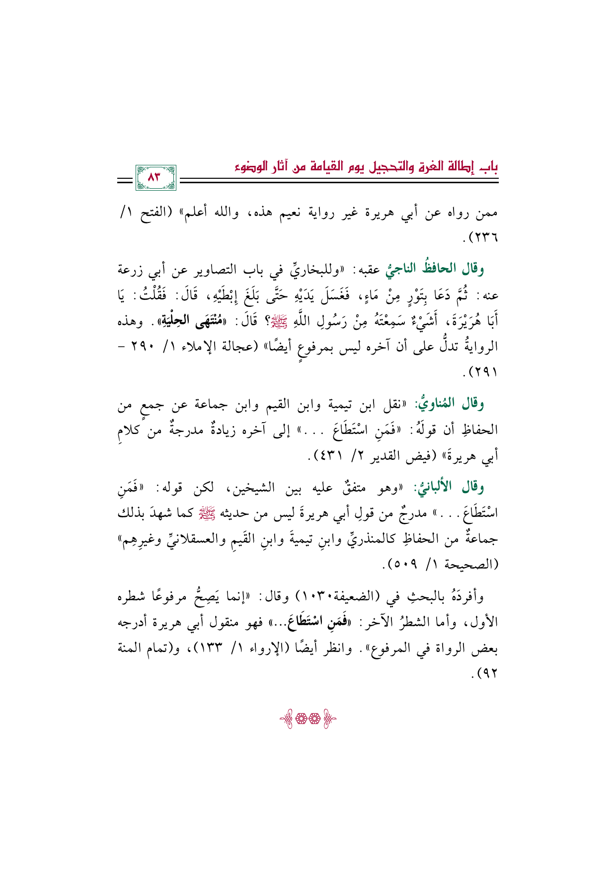 وقال الحافظُ الناجيُّ عقبه: "وللبخاريِّ في باب التصاوير عن أبي زرعة عنه: ثُمَّ دَعَا بِتَوْرٍ مِنْ مَاءٍ، فَغَسَلَ يَدَيْهِ حَتَّى بَلَغَ إِبْطَيْهِ، قَالَ: فَقُلْتُ: يَا أَبَا هُرَيْرَةَ، أَشَيْءٌ سَمِعْتَهُ مِنْ رَسُولِ اللَّهِ صلى الله عليه وسلم؟ قَالَ: «مُنْتَهَى الحِلْيَةِ». وهذه الروايةُ تدلُّ على أن آخره ليس بمرفوعٍ أيضًا" (عجالة الإملاء ١/ ٢٩٠ - ٢٩١).