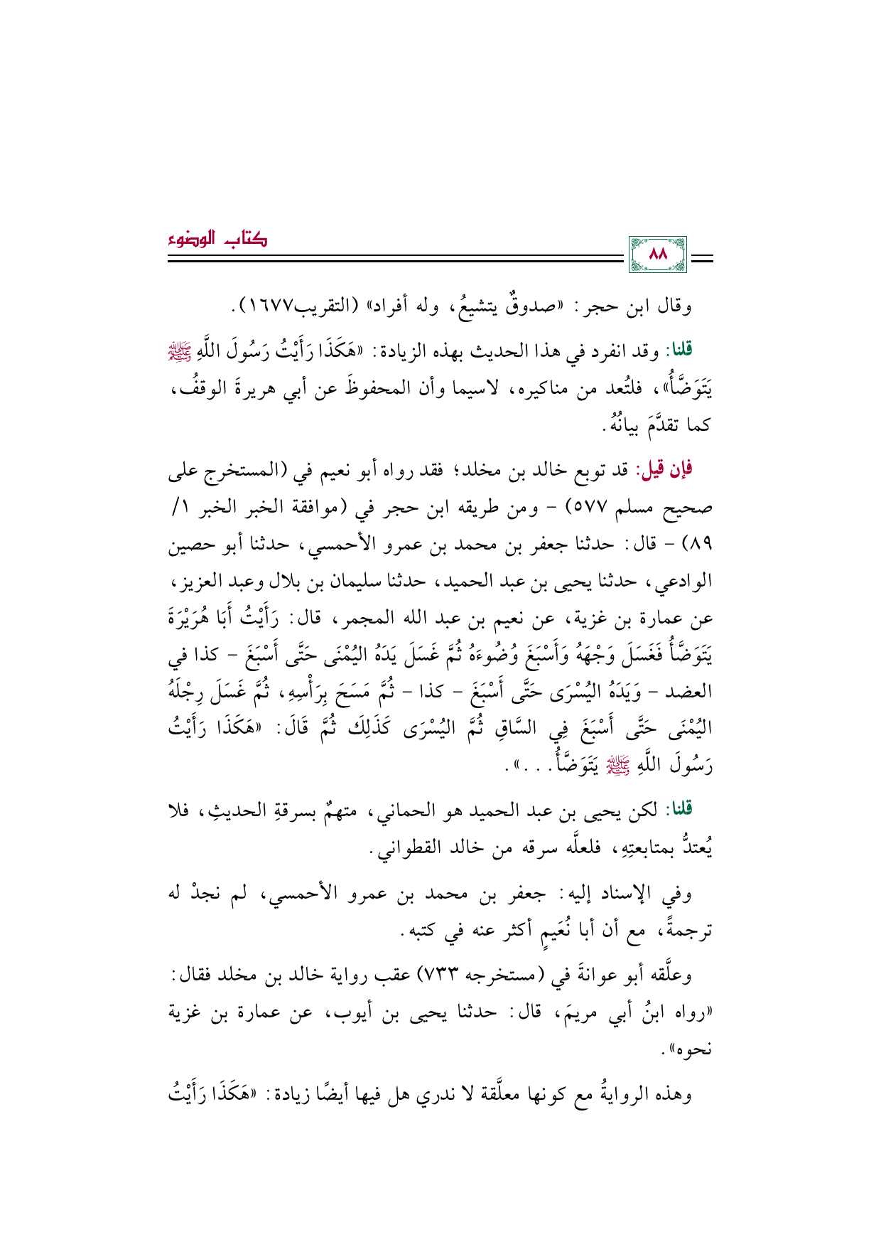 قلنا: وقد انفرد في هذا الحديث بهذه الزيادة: ((هَكَذَا رَأَيْتُ رَسُولَ اللَّهِ صلى الله عليه وسلم يَتَوَضَّأُ))، فلتُعد من مناكيره، لاسيما وأن المحفوظَ عن أبي هريرةَ الوقفُ، كما تقدَّمَ بيانُهُ.