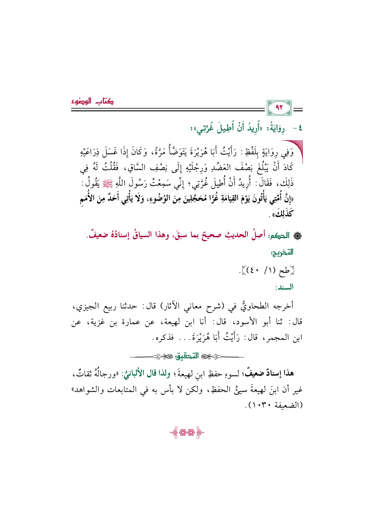 أخرجه الطحاويُّ في (شرح معاني الآثار) قال: حدثنا ربيع الجيزي، قال: ثنا أبو الأسود، قال: أنا ابن لهيعة، عن عمارة بن غزية، عن ابن المجمر، قال: رَأَيْتُ أَبَا هُرَيْرَةَ ... فذكره.