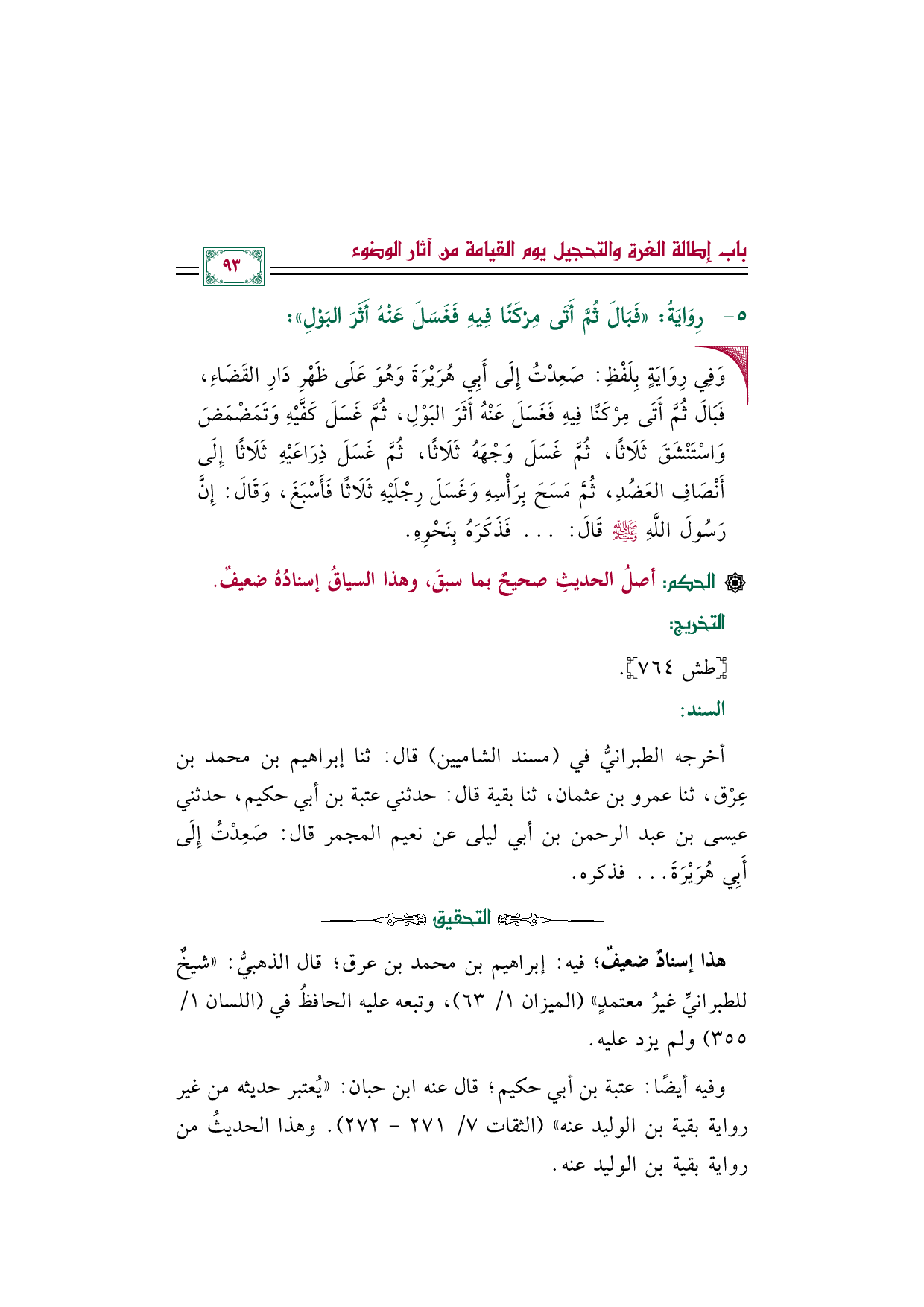 أخرجه الطبرانيُّ في (مسند الشاميين) قال: ثنا إبراهيم بن محمد بن عِرْق، ثنا عمرو بن عثمان، ثنا بقية قال: حدثني عتبة بن أبي حكيم، حدثني عيسى بن عبد الرحمن بن أبي ليلى عن نعيم المجمر قال: صَعِدْتُ إِلَى أَبِي هُرَيْرَةَ ... فذكره.