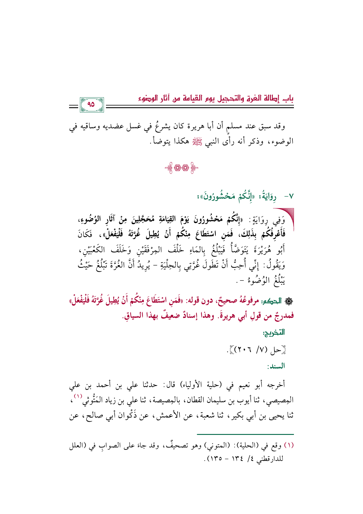 [الحكم]: مرفوعُهُ صحيحٌ، دون قوله: «فَمَنِ اسْتَطَاعَ مِنْكُمْ أَنْ يُطِيلَ غُرَّتَهُ فَلْيَفْعَلْ» فمدرجٌ من قولِ أبي هريرةَ. وهذا إسنادٌ ضعيفٌ بهذا السياقِ.