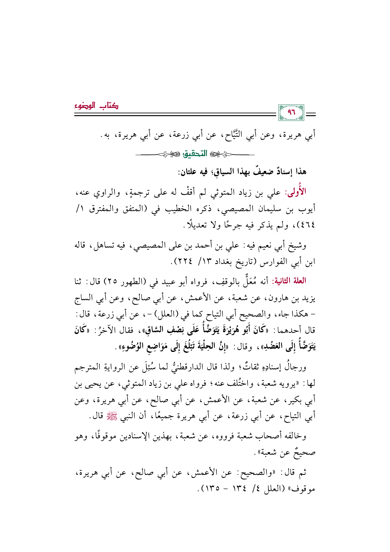 العلة الثانية: أنه مُعَلٌّ بالوقفِ، فرواه أبو عبيد في (الطهور ٢٥) قال: ثنا يزيد بن هارون، عن شعبة، عن الأعمش، عن أبي صالح، وعن أبي الساج -هكذا جاء، والصحيح أبي التياح كما في (العلل) -، عن أبي زرعة، قال: قال أحدهما: «كَانَ أَبُو هُرَيْرَةَ يَتَوَضَّأُ عَلَى نِصْفِ السَّاقِ»، فقال الآخرُ: «كَانَ يَتَوَضَّأُ إِلَى العَضُدِ»، وقال: «إِنَّ الحِلْيَةَ تَبْلُغَ إِلَى مَوَاضِعِ الوُضُوءِ».