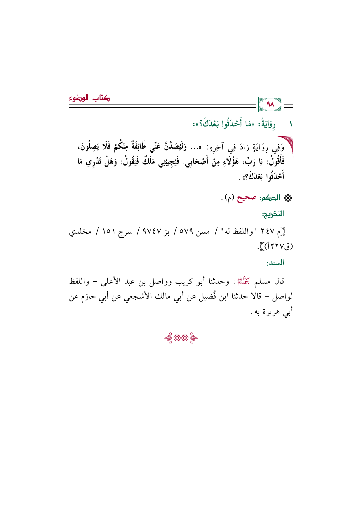 • وَفِي رِوَايَةٍ زادَ فِي آخِرِهِ: « ... وَلَيُصَدَّنَّ عَنِّي طَائِفَةٌ مِنْكُمْ فَلَا يَصِلُونَ، فَأَقُولُ: يَا رَبِّ، هَؤُلَاءِ مِنْ أَصْحَابِي. فَيُجِيبُنِي مَلَكٌ فَيَقُولُ: وَهَلْ تَدْرِي مَا أَحْدَثُوا بَعْدَكَ؟».