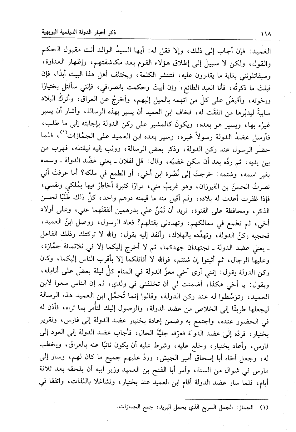 العميد : فإن أجاب إلى ذلك ، وإلا فقل له : أيها السيد الوالد أنت مقبول الحكم والقول ، ولكن لا سبيل إلى إطلاق هؤلاء القوم بعد مكاشفتهم ، وإظهار العداوة ، وسيقاتلونني بغاية ما يقدرون عليه ، فتنتشر الكلمة ، ويختلف أهل هذا البيت أبداَ فإن قبلت ما ذكرته ، فأنا العبد الطائع ، وإن أبيت وحكمت بانصرافي ، فإنني سأقتل بختياراً وإخوته ، وأقبض على كلِّ من اتهمه بالميل إليهم ، وأخرج عن العراق ، وأترك البلاد سايبةً ليدبَّرها من اتفقت له ، فخاف ابن العميد أن يسير بهذه الرسالة ، وأشار أن يسير غيره بها ، ويسير هو بعده ، ويكون كالمشير على ركن الدولة بأجابته إلى ما طلب ، فأرسل عضد الدولة رسولاً غيره ، وسير بعده ابن العميد على الجمَّازات ، فلما حضر الرسول عند ركن الدولة ، وذكر بعض الرسالة ، ووثب إليه ليقتله ، فهرب من بين يديه ، ثم ردَّه بعد أن سكن غضبه ، وقال : قل لفلان يعني عضد الدولة وسماه بغير اسمه ، وشتمه : خرجت إلى نصرة ابن أخي ، أو الطمع في ملكه ؟ أما عرفت أني نصرت الحسن بن الفيرزان ، وهو غريب مني ، مراراً كثيرة أخاطر فيها بملكي ونفسي ، فإذا ظفرت أعدت له بلاده ، ولم أٌقبل منه ما قيمته درهم واحد ، كلَّ طلباً لحسن الذكر ، ومحافظة على الفتوة ، تريد أن تمنَّ على بدرهمين أنفقتهما على ، وعلى أولاد أخي ، ثم تطمع في ممالكهم ، وتهددني بقتلهم ؟ فعاد الرسول ، ووصل ابن العميد ، فحجبه ركن الدولة ، وتهدَّده بقتلهم ؟ فعاد الرسول ، ووصل ابن العميد ، فحجبه ركن الدولة ، وتهدَّده بالهلاك ، وأنفذ إليه يقول : والَّله لا تركتك وذلك الفاعل يعني عضد الدولة تجتهدان جهدكما ، ثم لا أخرج إليكما إلا في ثلثمائة جمَّازة ، وعليها الرجال ، ثم أثبتوا إن شئتم ، فوالَّله لا أقاتلكما إلا بأقرب الناس إليكما ، وكان ركن الدولة يقول : يا أخي هكذا ، أضمنت لي أن تحفظ في ولدي ، ثم أن الناس سعوا لإبن العميد هذه الرسالة ليجعلها طريقاً إلى الخلاص من عضد الدولة ، والوصول إليك لتأمر بما نراه ، فأذن له في الحضور عنده ، واجتمع به وضمن إعاده بختيار عضد الدولة إلى فارس ، وتقريربختيار ، فردّه إلى عضد الدولة فعرّفه جليَّة الحال ، فأجاب عضد الدولة إلى العود إلى فارس ، وأعاد بختيار ، وخلع عليه ، وشرط عليه أن يكون نائياً عنه بالعراق ، ويخطب له ، وجعل أخاه أبا إسحاق أمير الجيش ، وردَّ عليهم جميع ما كان لهم ، وسار إلى فارس في شوال من السنة ، وأمر أبا الفتح بن العميد وزير أبيه أن يلحقه بعد ثلاثة أيام ، فلما سار عضد الدولة أقام ابن العميد عند بختيار ، وتشاغلا باللذات ، واتفقا في
