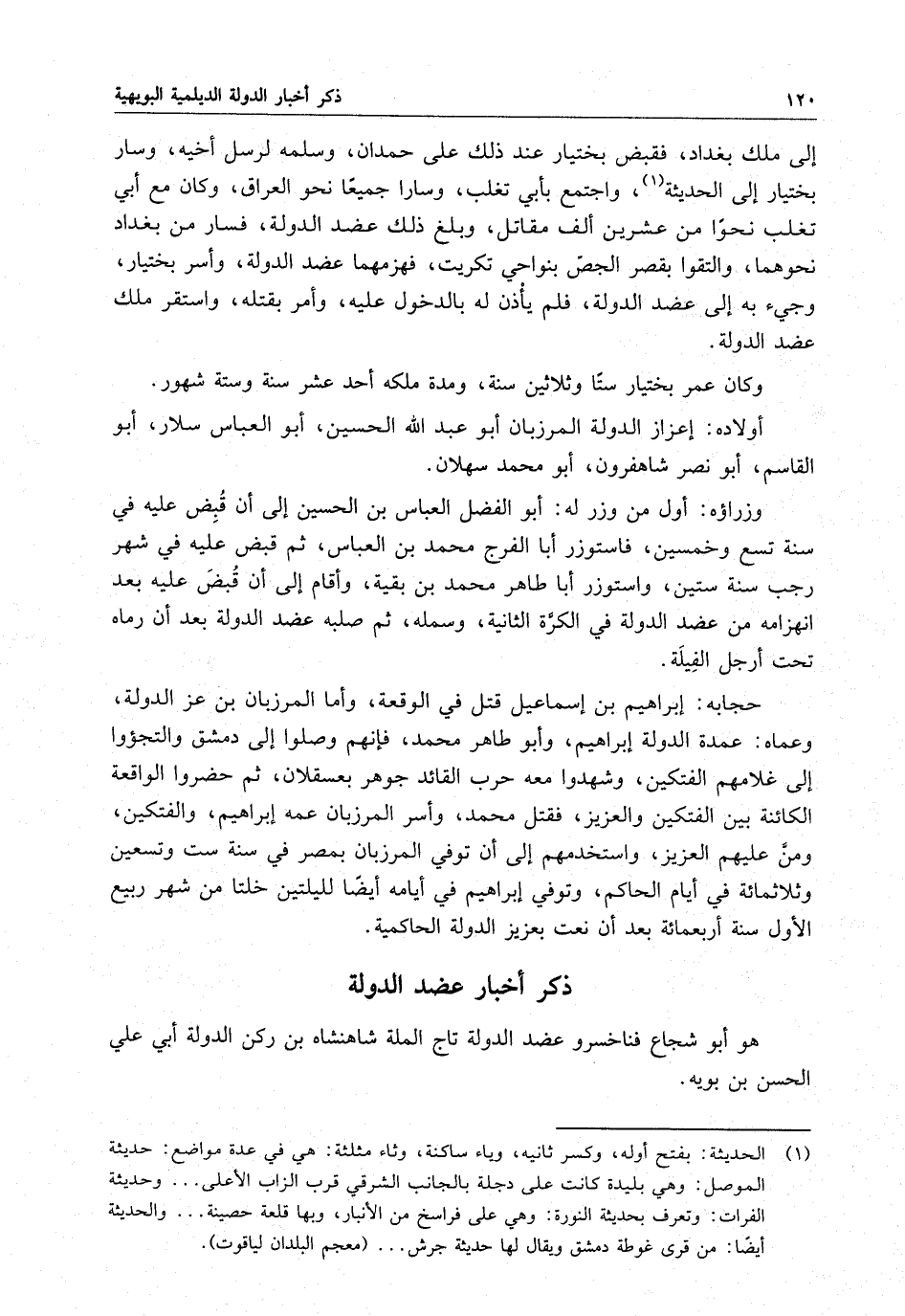 إلى ملك بغداد ، فقبض بختيار عند ذلك على حمدان ، وسلمه لرسل أخيه ، وسار بختيار إلى الحديثة ، واجتمع بأبي تغلب نحواً من عشرين ألف مقاتل ، وبلغ ذلك عضد الدولة ، فسار من بغداد نحوهما ، والتقوا بقصر الجصّ بنواحي تكريت ، فهزمهما عضد الدولة ، وأسر بختيار ، وجيء به إلى عضد الدولة ، فلم يأذن له بالدخول عليه ، وأمر بقتله ، واستقر ملك عضد الدولة .