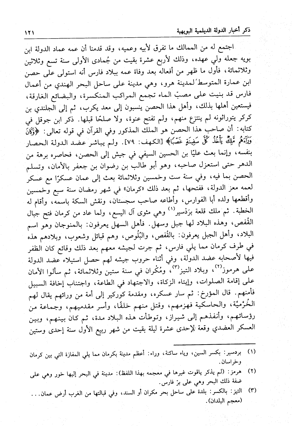 اجتمع له من الممالك ما تفرق لأبيه وعميه ، وقد قدمنا أن عمه عماد الدولة بن بويه جعله ولي عهده ، وذلك لأربع عشرة بقيت من جماد الأولى سنة تسع وثلاثين وثلثمائة ، فأول ما ظهر من أفعاله بعد وفاة عمه ببلاد فارس أنه استولى على حصن ابن عمارة المتوسط لمدينة هرو ، وهي مدينة على ساحل البحر الهندي من أعمال فارس قد بنيت على مصّب الماء تجمع المراكب المنكسرة ، والبضائع الغارقة ، فيستعين أهلها بذلك ، وأهل هذا الحصن ينسبون إلى معدي يكرب ، ثم إلى الجلندي بن كركر يتوارثونه لم ينتزع منهم ، ولم تفتح عنوة ، ولا صلحا قبلها . ذكر بن جوقل في كتابه : أن صاحب هذا الحصن هو الملك المذكو وفي القرآن في قوله تعالى : وكان وراءهم مَّلك يأخذ كلَّ سفينةٍ غصباً . ولم يباشر عضد الدولة الحصار بنفسه ، وإنما بعث علياً بن الحسين السيفي في جيش إلى الحصن ، فحاصره برهة من الدهر حتى استعزل صاحبه ، وهو أبو طالب بن رضوان بن جعفر بالأمان ، وتسلم الحصن بما فيه ، وفي سنة ست وخمسين وثلثمائة بعث إلى عمان عسكرا مع عسكر لعمه معز الدولة ، ففتحها ، ثم بعد ذلك كرمان في شهر رمضان سنة سبع وخمسين وأقطعها ولده أبا الفوارس ، وأطاعه صاحب سجستان ، ونقش السكة باسمه ، وأقام له الخطبة . ثم ملك قلعة بردسير وهي مثوى آل اليسع ، ولما عاد من كرمان فتح جبال القفص ، وهذه البلاد لها جبل وسهل . فأهل السهل يعرفون : بالمنوجان وهو اسم البلاد ، وأهل الجبل يعرفون : بالقفص ، والبلوص ، وهم قبائل وشعوب ، وبلادهم هذه في طرف كرمان مما يلي فارس ، ثم جرت لجيشه معهم بعد ذلك وقائع كان الظفر فيها لأصحاب عضد الدولة ، وفي أثناء حرول جيشه لهم حصل استيلاء عضد الدولة على هرموز ، وبلاد التيز ، ومكران في سنة ستين وثلثمائة ، ثم سألوا الأمان على إقامة الصلوات ، وإيتاء الزكاة ، والإجتهاد في الطاعة ، واجتناب إخافة السبيل فأمنهم . قال المؤرخ : ثم سار عسكره ، ومقدمة كوركير إلى أمة من ورائهم يقال لهم الخرَّميَّة ، والحاسكية فهزمهم ، وقتل منهم خلقاً ، وأسر مقدميهم ، وجماعة من رؤسائهم ، وأنفذهم إلى شيراز ، وتوطأت هذه البلاد مدة ، ثم كان بينهم ، وبين العسكر العضدى وقعة لإحدى عشرة ليلة يقيت من شهر ربيع الأول سنة إحدى وستين