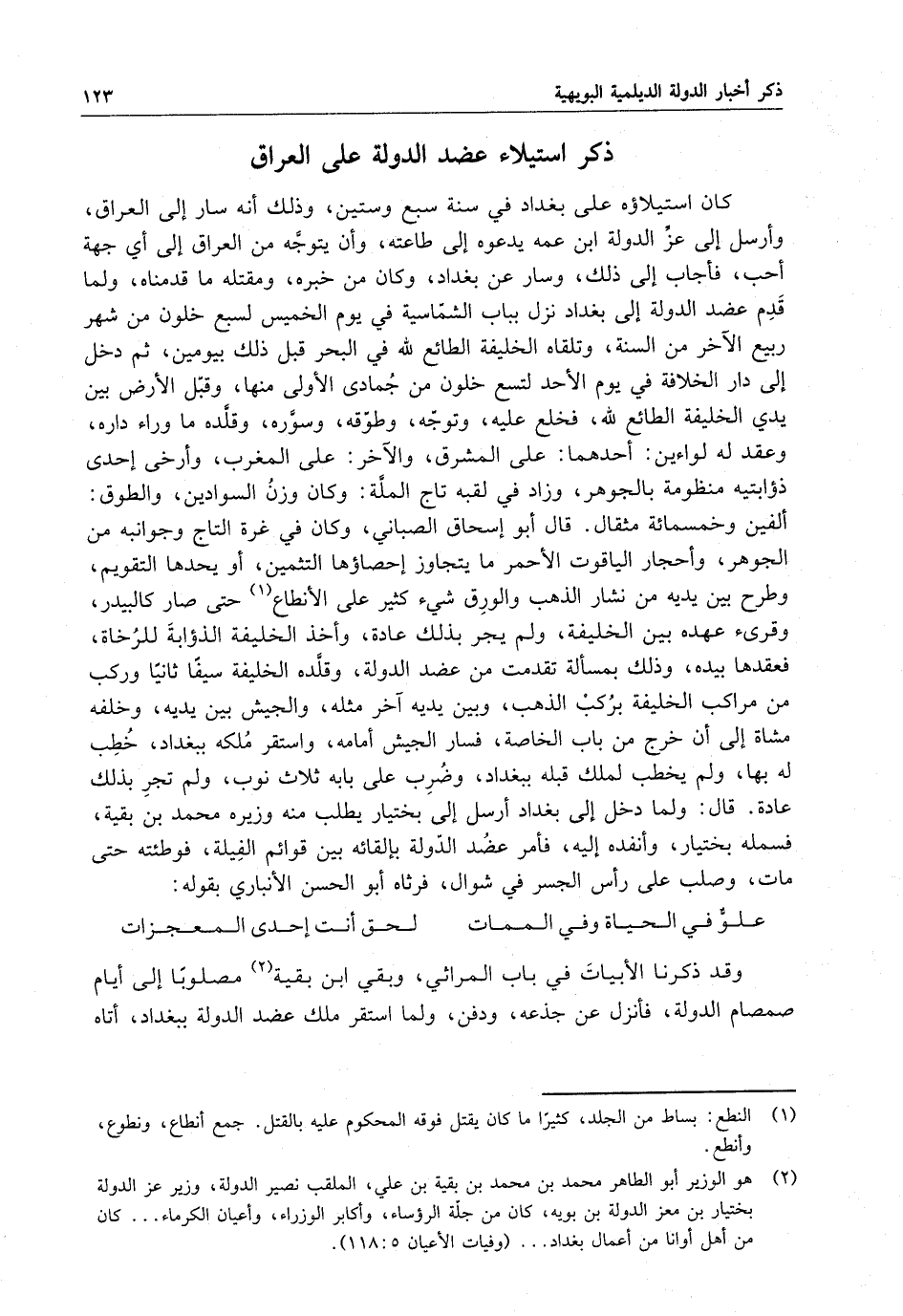 كان اسيتلاؤه على بغداد في سنة سبع وستين ، وذلك أنه سار إلى العراق ، وأرسل إلى عزَّ الدولة ابن عمه يدعوه إلى طاعته ، وأن يتوجَّه من العراق إلى أي جهة أحب ، فأجاب إلى ذلك ، وسار عن بغداد ، وكان من خبره ، ومقتله ما قدمناه ، ولما قدم عضد الدولة إلى بغداد نزل بباب الشمّاسية في يوم الخميس لسبع خلون من شهر ربيع الآخر من السنة ، وتلقاه الخليفة الطائع للَّه في البحر قبل ذلك بيومين ، ثم دخل إلى دار الخلافة في يوم الأحد لتسع خلون من جمادى الأولى منها ، وقبل الأرض بين يدي الخليفة الطائع للَّه ، فخلع عليه ، وتوجّه ، وطوّقة ، وسوَّرة ، وقلَّده ما وراء داره ، وعقد له لواءين : أحدهما : على المشرق ، والآخر : على المغرب ، وأرخى إحدى ذؤابتيه منظومة بالجوهر ، وزاد في لقبه تاج الملَّة : ، وكان وزن السوادين ، والطوق : ألفين وخمسمائة مثقال . قال أبو اسحاق الصباني ، وكان في غرة التاج وجوانبه من الجوهر ، وأحجار الياقوت الأحمر ما يتجاوز إحصاؤها التثمين ، أو يحدها التقويم ، وطرح بين يديه من نشار الذهب والورق شيء كثير على الأنطاع حتى صار كالبيدر ، وقرىء عهده بين الخليفة ، ولم يجر بذلك عادة ، وأخذ الخليفة الذؤابة للرخاة ، فعقدها بيده ، وذلك بمسألة تقدمت من عضد الدولة ، وقلَّده الخليفة سيفاً ثانياً وركب من مراكب الخليفة بركب الذهب ، وبين يديه آخر مثله ، والجيش بين يديه ، وخلفه مشاة إلى أن خرج من باب الخاصة ، فسار الجيش أمامه ، واستقر مُلكه ببغداد ، خُطب له بها ، ولم يخطب لملك قبله ببغداد ، وضُرب على بابه ثلاث نوب ، ولم تجر بذلك عادة ، قال : ولما دخل إلى بغداد أرسل إلى بختيار يطلب منه وزيره محمد بن بقية ، فسلمه بختيار ، وأنفذ إليه ، فأمر عضُد الدّولة بإلقائه بين قوائم الفيلة ، فوطئته حتى مات ، وصلب على رأس الجسر في شوال ، فرثاه أبو الحسن الأنباري بقوله :