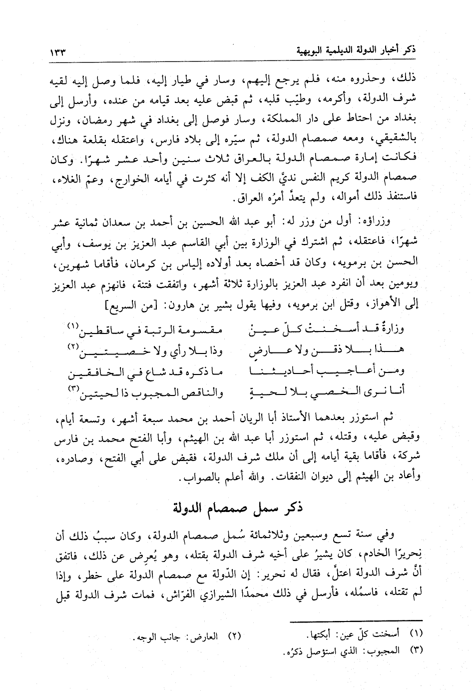 ذلك ، وحذروه منه ، فلم يرجع إليهم ، وسار في طيار إليه ، فلما وصل إليه لقيه شرف الدولة ، وأكرمه ، وطيب قلبه ، ثم قبض عليه بعد قيامه من عنده ، وأرسل إلى بغداد من احتاط على دار الملكة ، وسار فوصل إلى بغداد في شهر رمضان ، ونزل بالشقيقى ، ومعه صمصام الدولة ، ثم سيره إلى بلاد فارس ، واعتقله بقلعة هناك ، فكانت إمارة صمصام الدولة بالعراق ثلاث سنين وأحد عشر شهراً . وكان صمصام الدولة كريم النفس ندَّى الكف إلا أنه كثرت في أيامه الخوارج ، وعنم الغلاء ، فاستنفذ ذلك أمواله ، ولم يتعدَّ أمره العراق .