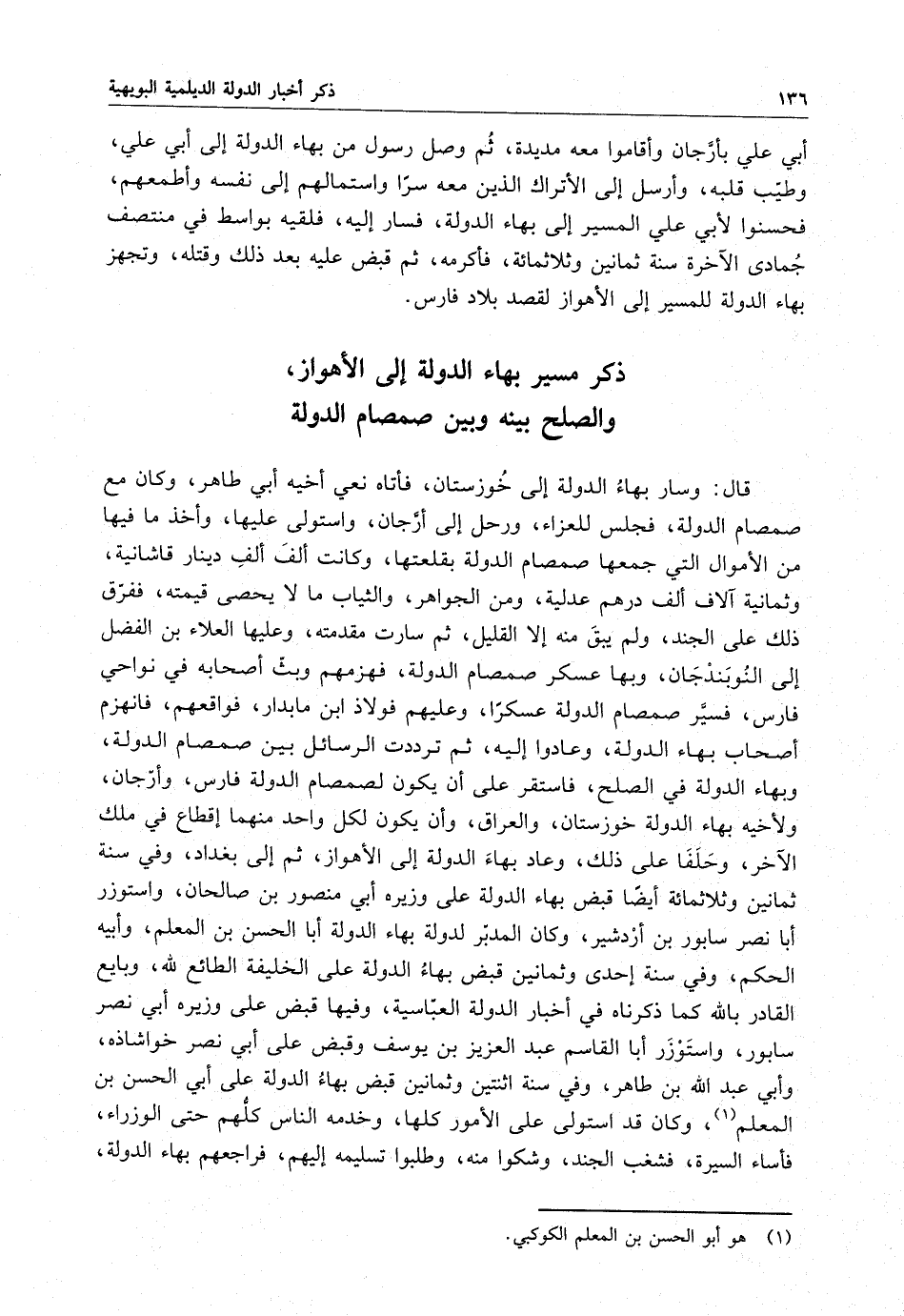 قال : وسار بهاء الدّولة إلى خوزستان ، فأتاه نعى أخيه أبي طاهر ، وكان مع صمصام الدولة ، فجلس للعزاء ، ورحل إلى أرَّجان ، واستولى عليها ، وأخذ ما فيها من الأموال التي جمعها صمصام الدولة بقلعتها ، وكانت ألف ألف دينار فاشانية ، وثمانية آلاف ألف درهم عدليه ، ومن الجواهر ، والثياب ما لا يحصى قيمته ، ففرّق ذلك على الجند ، ولم يبق منه إلا القليل ، ثم سارت مقدمته ، وعليها العلاء بن الفضل إلى النوبندجان ، وبها عسكر صمصام الدولة عسكراً ، وعليهم فولاذ ابن ما بدار ، فواقعهم ، فانهزم أصحاب بهاء الدولة ، وعادوا إليه ، ثم ترددت الرسائل بين صمصام الدولة ، وبهاء الدولة في الصلح ، فاستقر على أن يكون لصمصام الدولة فارس ، وأرجان ، ولأخيه بهاء الدولة خوزستان ، والعراق ، وأن يكون لككل واحد منهما إقطاع في ملك الآخر ، وحلفا على ذلك ، وعاد بهاء الدولة إلى الأهواز ، ثم إلى بغداد ، وفي سنة ثماني وثلثمائة أيضاً قبض بهاء الدولة على وزيره أبي منصور بن صالحان ، واستوزر أبا نصر سابور بن أردشر ، وكان المدبّر لدولة بهاء الدولة أبا الحسن بن المعلم ، وأبيه الحكم ، وفي سنة إحدى وثمانين قبض بهاءُ الدولة على الخليفة الطائع لله ، وبايع القادر بالله كما ذكرناه في أخبار الدولة العبّاسية ، وفيها قبض على وزيره أبي نصر سابور ، واستوزر أبا القاسم عبد العزيز بن يوسف وقبض على أبي نصر خواشاذه ، وأبي عبد الله بن طاهر ، وفي سنة اثنتين وثمانين قبض بهاء الدّولة على أبي الحسن بن المعلم ، وكان قد استولى على الأمور كلها ، وخدمه الناس كلُّهم حتى الوزراء ، فأساء السيرة ، فشغب الجند ، وشكوا منه ، وطلبوا تسليمه إليهم ، فراجعهم بهاء الدولة ،