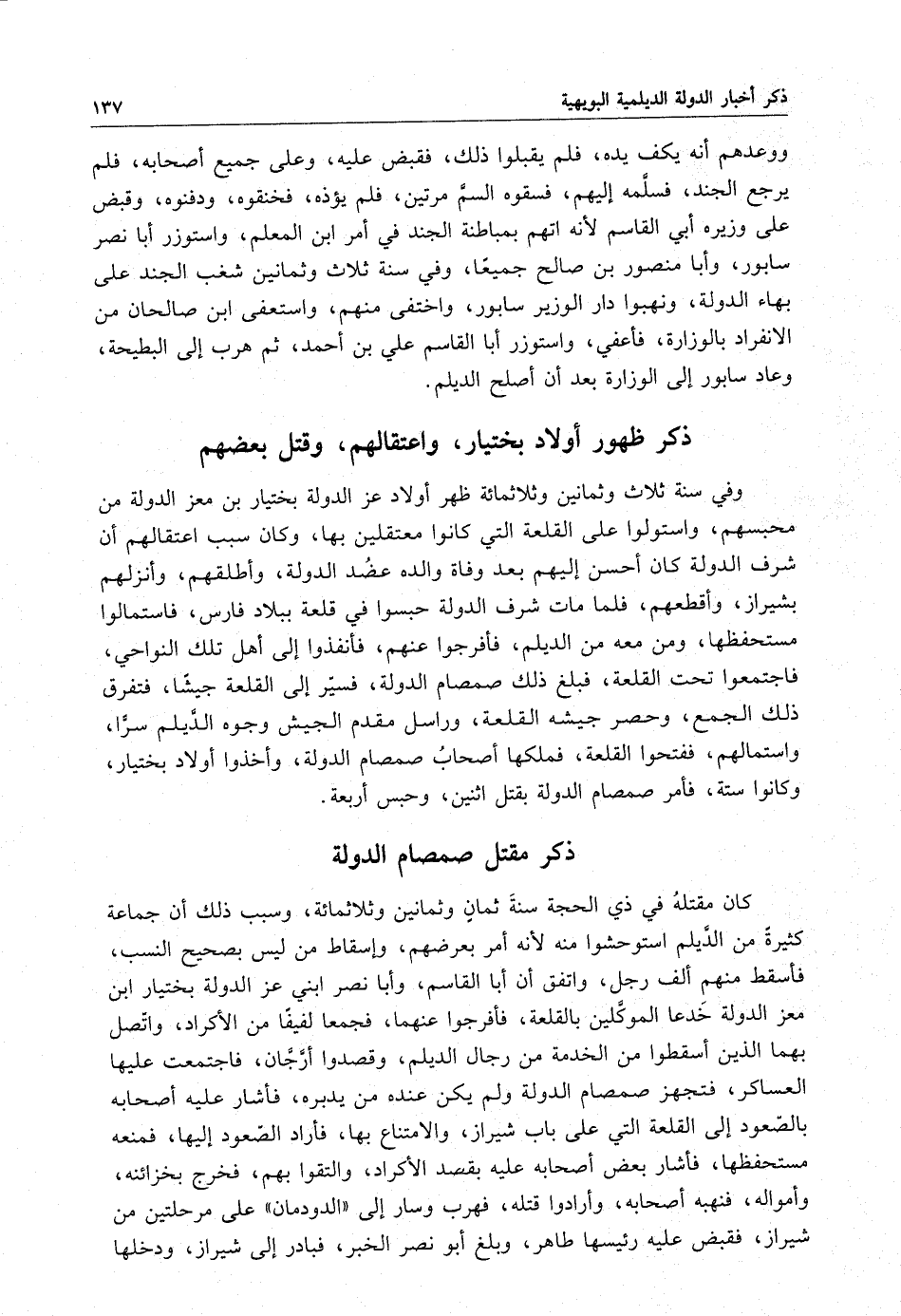 ووعدهم أنه يكف يده ، فلم يقبلوا ذلك ، فقبض عليه ، وعلى جميع بهاء الدولة ، ووعدهم أنه يكف يده ، فلم يقبلوا ذلك ، فقبض عليه ، وعلى جميع أصحابه ، فلم يرجع الجند ، فسلَّمه إليهم ، فسقوه السمَّ مرتين ، فلم يؤذه ، فخنقوه ، ودفنوه ، وقبض على وزيره أبي القاسم لأنه اتهم بمباطنة الجند في أمر ابن المعلم ، واستوزر أبا نصر سابور ، وأبا منصور بن صالح جميعاً ، وفي سنة ثلاث وثمانين شغب الجند على بهاء الدولة ، ونهبوا دار الوزير سابور ، واختفى منهم ، واستعفى ابن صالحان من الأنفراد بالوزارة ، فأعفى ، واستوزر أبا القاسم على بن أحمد ، ثم هرب إلى البطيحة ، وعاد سابور إلى الوزارة بعد أن أصلح الديلم .