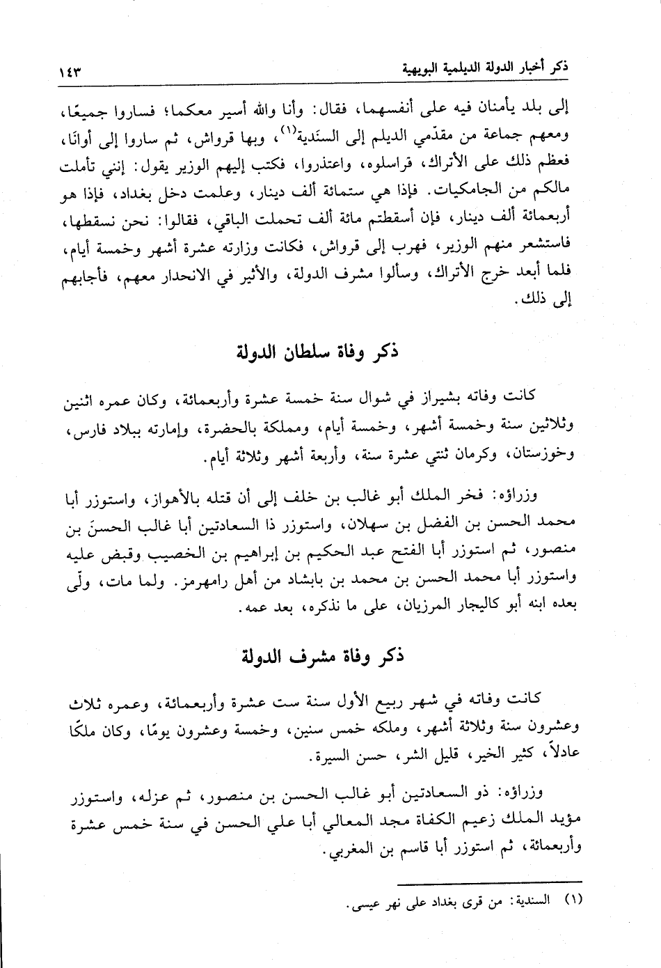 إلى بلد يأمنان فيه على أنفسهما ، فقال : وأنا والَّله أسير معكما ؛ فساروا جميعاً ، ومعهم جماعة من مقدّمي الديلم إلى السندية ، وبها قرواش ، ثم سروا إلى أوانا ، فعظم ذلك على الأتراك ، فراسلوه ، واعتذروا ، فكتب إليهم الوزير يقول : إنني تأملت ما لكم من الجامكيات . فإذا هي ستمائة ألف دينار ، وعلمت دمخل بغداد ، فلإذا هو أربعمائة ألف دينار ، فإن أسقطتم مائة ألف تحملت الباقي ، فقالوا : نحن نسقطها ، فاستشعر منهم الوزير ، فهرب إلى قرواش ، فكانت وزراته عشرة أشهر وخمسة أيام ، فلما أبعد خرج الأتراك ، وسألوا مشرف الدولة ، والأثير في الانحدار معهم ، فأجابهم إلى ذلك .