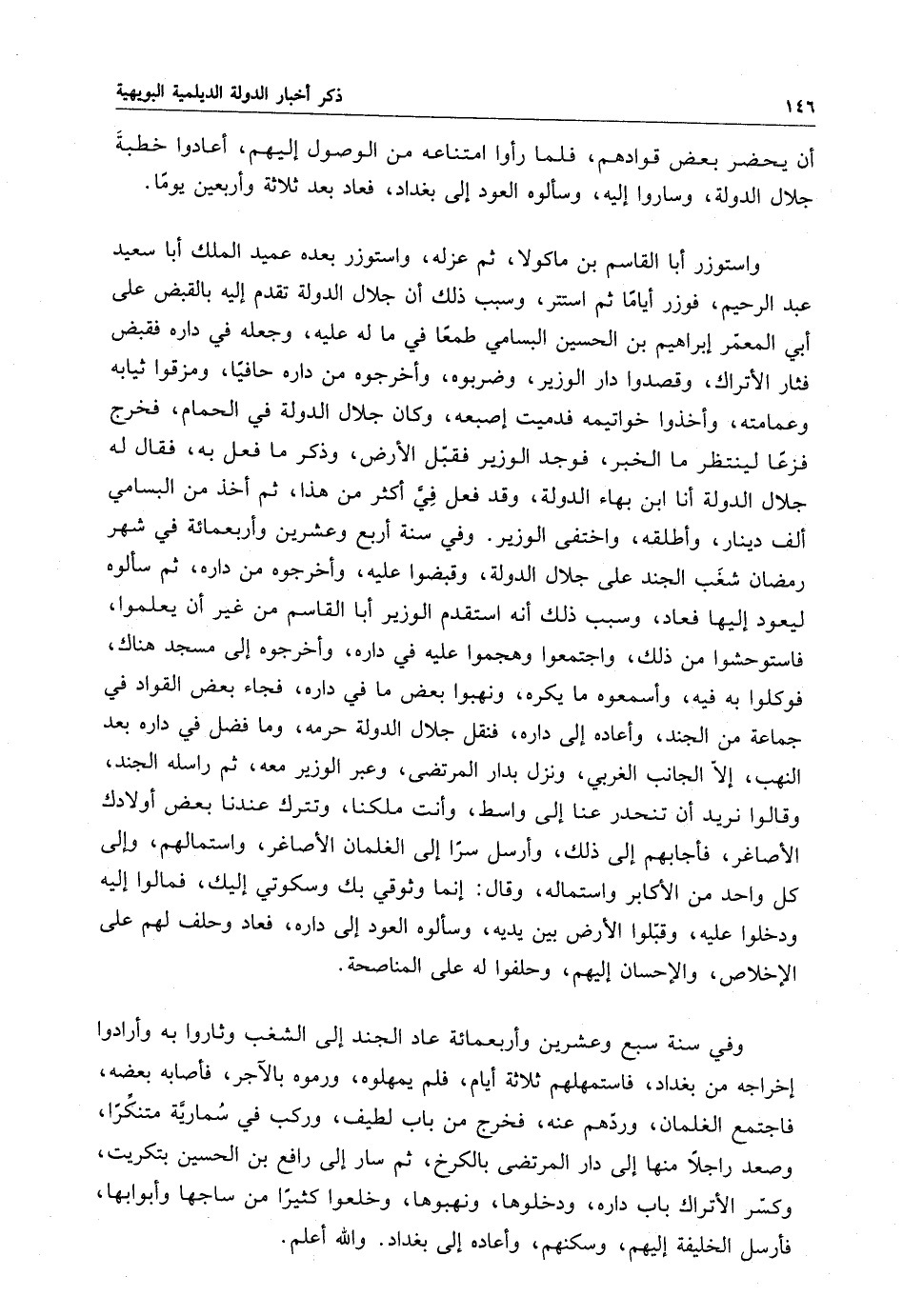 وفي سنة أربع وعشرين وأربعمائة في شهر رمضان شغب الجند على جلال الدولة ، وقبضوا عليه ، وأخرجوه من داره ، ثم سألوه ليعود إليها فعاد ، وسبب ذلك أنه استقدم الوزير أبا القاسم من غير أن يعلموا ، فاستوحشوا من ذلك ، واجتمعوا وهجموا عليه في داره ، وأخرجوه إلى مسجد هناك ، فوكلوا به فيه ، وأسمعوا ما يكره ، ونهبوا بعض ما في داره ، فجاء بعض القواد في جماعة من الجند ، وأعاده إلى داره ، فنقل جلال الدولة حرمه ، وما فضل في داره بعد النهب ، إلا الجانب الغربي ، ونزل وبدار المرتضى ، وعبر الوزير معه ، ثم أرسله الجند ، وقالوا نريد أن تنحدر عنا إلى واسط ، وأنت ملكنا ، وتترك عندنا بعض أولادك الأصاغر ، فأجابهم إلى ذلك ، وأرسل سراً إلى الغلمان الأصاغر ، واستمالهم ، وإلى كل واحد من الأكابر واستماله ، وقال : إنما وثوقي بك وسكوتي إليك ، فمالوا إليه ودخلوا عليه ، وقبلوا الأرض بين يديه ، وسألوه العود إلى داره ، فعاد وحلف لهم على الإخلاص ، والإحسان إليهم ، وحلفوا له على المناصحة .