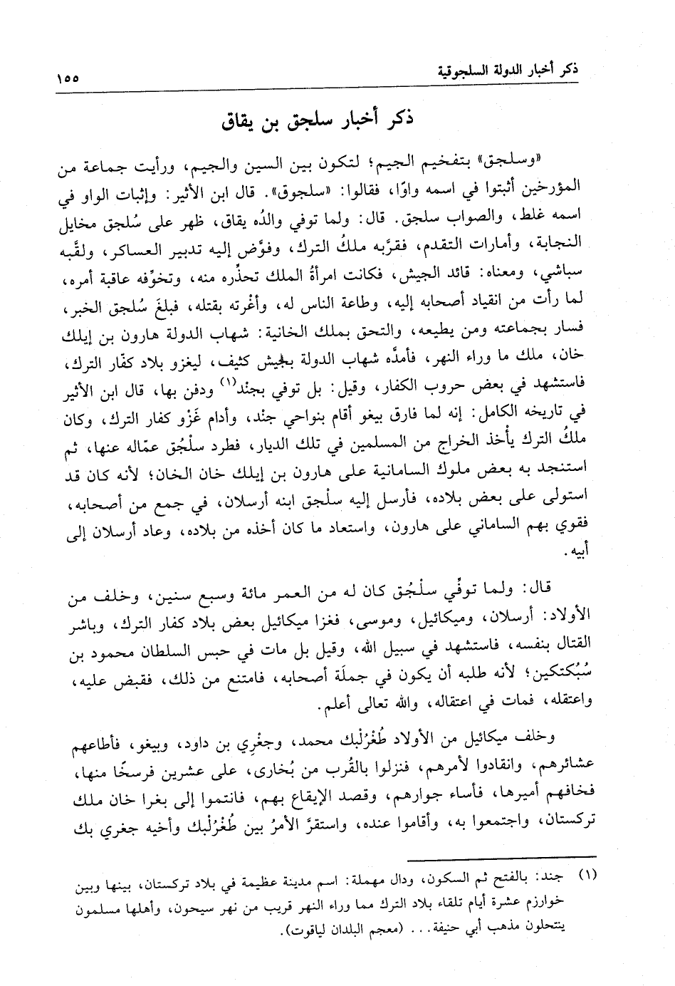 وسلجق بتفخيم الجيم ، لتكون بين السين والجيم ، ورأيت جماعة من المؤرخين اثبتوا في اسمه واواً ، فقالوا : سلجوق . قال ابن الأثير : وإثبات الواو في اسمه غلط ، والصواب سلجق . قال : ولما توفي والده يقاق ، ظهر على سلجق مخايل النجابة ، وإمارات التقدم ، فقربه ملك الترك ، وفوَّض إليه تدبير العساكر ، ولقبَّه سباشي ، ومعناه قائد الجيش ، فكانت امرأة الملك تحذَّره منه ، وتخوِّفه عاقبة أمره ، لما رأت من انقياد أصحابه أليه ، وطاعة الناس له ، وأغرته بقتله ، فبلغ سلجق الخبر ، فسار بجماعته ومن يطيعه ، والتحق بملك الخانية : شهاب الدولة هارون بن إيلك خان ، ملك ما وراء النهر ، فأمدَّه شهاب الدولة بجيش كثيف ، ليغزو بلاد كفار الترك ، فاستشهد في بعض حروب الكفار ، وقيل : بل توفي بجند ودفن بها ، قال ابن الأثير في تاريخه الكامل : إنه لما فارق بيغو أقام بنواحي جند ، وأدام غزو كفار الترك ، وكان ملك الترك يأخذ الخراج من المسلمين في تلك الديار ، فطرد سلجق عمّاله عنها ، ثم استنجد به بعض ملوك السامانية على هارون بن إيلك خان الخان ، لأنه كان قد استولى على بعض بلاده ، فأرسل إليه سلجق ابنه أرسلان ، في جمع من أصحابه ، فقوي بهم الساماني على هارون ، واستعاد ما كان أخذه من بلاده ، وعاد أرسلان إلى أبيه .