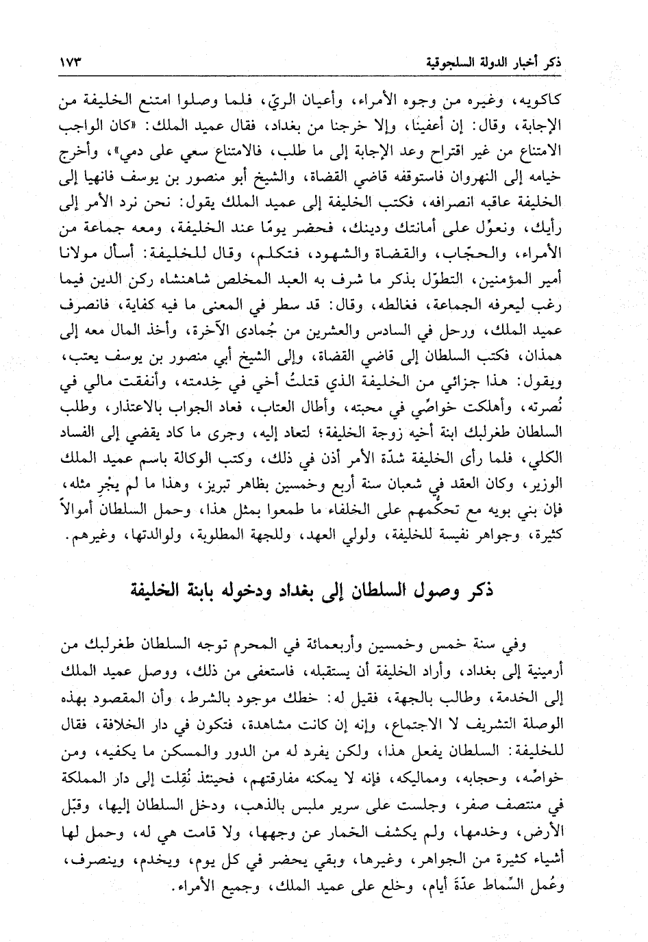كاكويه ، وغيره من وجه الأمراء ، وأعيان الري ، فلما وصلوا امتنع الخليفة من الإجابة ، وقال : إن أعفينا ، وغلا خرجنا من بغداد ، فقال : عميد الملك : كان الواجب الامتناع من غير اقتراح وعد الإجابة إلى ما طلب ، فالامتناع سعي على دمي ، واخرج خيامه إلى النهروان فاستوقفه قاضي القضاة ، والشيخ أبو منصور بن يوسف فانهيا إلى الخليفة عاقبة انصرافه ، فكتب الخليفة إلى عميد الملك يقول : نحن نرد الأمر إلى رأيك ، ونعوِّل على أمانتك ودينك ، فحضر يوما عند الخليفة ، ومعه جماعة من الأمراء ، والحجّاب ، والقضاة ، والشهود ، فتكلم ، وقال للخليفة : أسأل مولانا أمير المؤمنين ، التطول بذكر ما شرف به العبد المخلص شاهنشاه ركن الدين فيما رغب ليعرفه الجماعة ، فغالطه ، وقال : قد سطر في المعنى ما فيه كفاية ، فانصرف عميد الملك ، ورحل في السادس والعشرين من جمادى الآخرة ، وأخذ المال معه إلى همذان ، فكتب السلطان إلى قاضي القضاة ، وإلى الشيخ أبي منصور بن يوسف يعتب ، ويقول : هذا جزائي من الخليفة الذي قتلت أخي في خدمته ، وأنفقت مالي في نصرته ، وأهلكت خواصي في محبته ، وأطال العتاب ، فعاد الجواب بالاعتذار ، وطلب السلطان طغرلبك ابنة أخيه زوجة الخليفة ؛ لتعاد إليه ، وجرى ما كاد يقضي إلى الفساد الكلي ، فلما رأى الخليفة شدة الأمر أذن في ذلك ، وكتب الوكالة باسم عميد الملك الوزير ، وكان العقد في شعبان سنة أربع وخمسين بظاهر تبريز ، وهذا لم يجر مثله ، فإن بني بويه مع تحكمهم على الخلفاء ما طمعوا بمثل هذا ، وحمل السلطان أموالاً كثيرة ، وجواهر نفيسة للخليفة ، ولولي العهد ، وللجهة المطلوبة ، ولوالدتها ، وغيرهم .