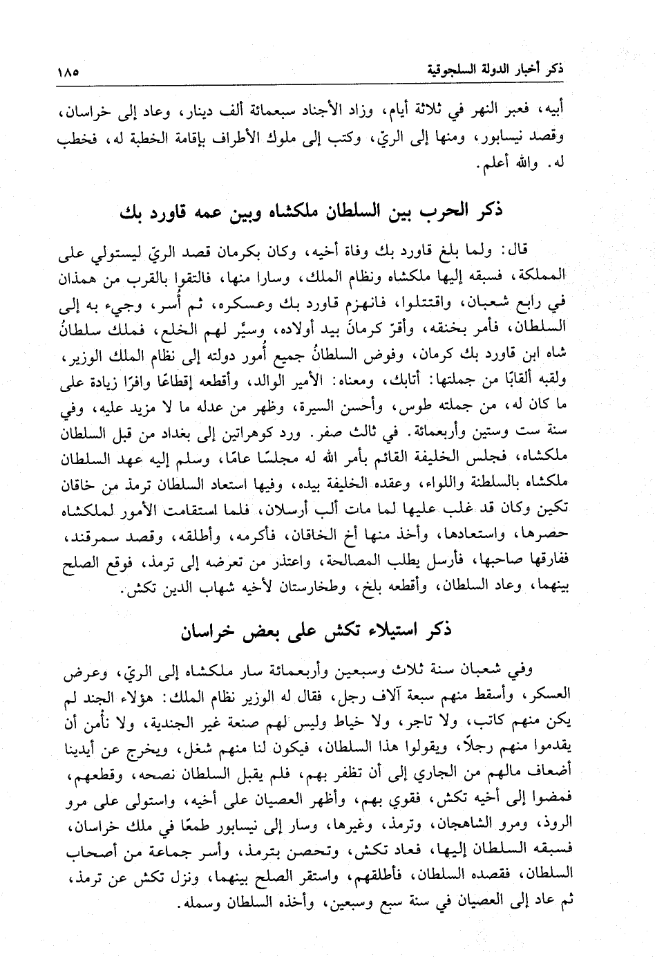 قال : ولما بلغ قاورد بك وفاة أخيه ، وكان بكرمان قصد الري ليستولي على المملكة ، فسبقه إليها ملكشاه ونظام الملك ، وسارا منها ، فالتقوا بالقرب من همذان في رابع شعبان ، واقتتلوا ، فانهزم قاورد بك وعسكره ، ثم أُسر ، وجيء به إلى السلطان ، فأمر بخنقه ، وأقرّ كرمان بيد أولاده ، وسيّر لهم الخلع ، فملك سلطان شاه بن قاورد بك كرمان ، وفوض السلطان جميع أمور دولته إلى نظام الملك الوزير ، ولقبه ألقاباً من جملتها : أتابك ، ومعناه : الأمير الوالد ، وأقطعه إقطاعاً وافراً زيادة على ما كان له ، من جملته طوس ، وأحسن السيرة ، وظهر من عدله ما لا مزيد عليه ، وفي سنة ست وستين وأربعمائة . في ثالث صفر . ورد كوهراتين إلى بغداد من قبل السلطان ملكشاه ، فجلس الخليفة القائم بأمر الله له مجلساً عاماً ، وسلم إليه عهد السلطان ملكشاه بالسلطنة واللواء ، وعقده الخليفة بيده ، وفيها استعاد السلطان ترمذ من خاقان تكين وكان قد غلب عليهما لما مات ألب أرسلان ، فلما استقامت الأمور لملكشاه حصرها ، واستعادها ، ففارقها صاحبها ، فأرسل يطلب المصالحة ، واعتذر من تعرضه إلى ترمذ ، فوقع الصلح بينهما ، وعاد السلطان ، وأقطعه بلخ ، وطخارستان لأخيه شهاب الدين تكش .
