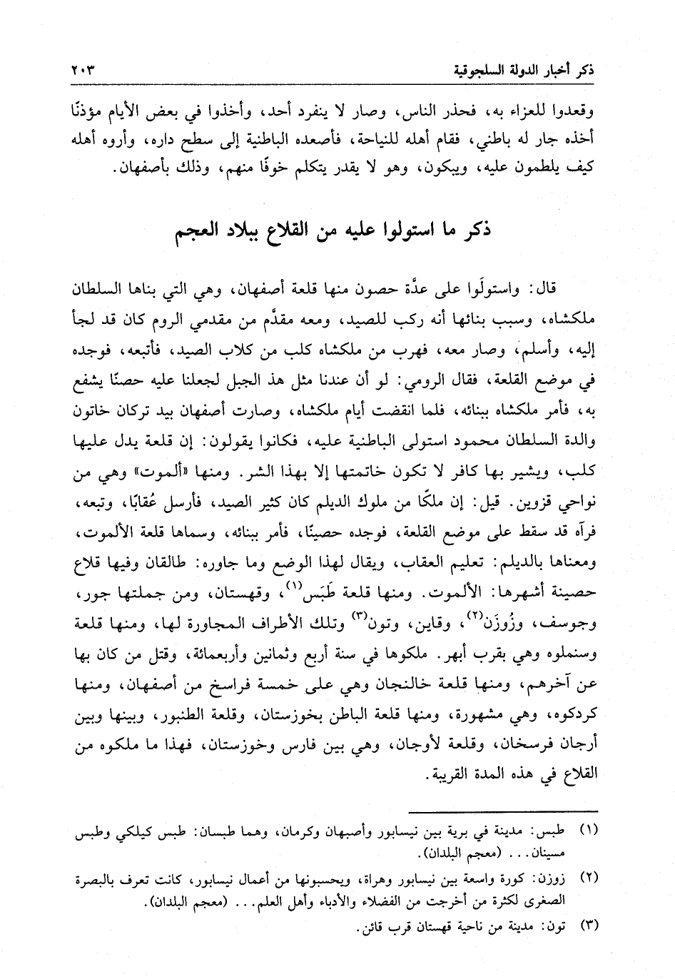 قال : واستولوا على عدّة حصون منها قلعة أصفهان ، وهي التي بناها السلطان ملكشاه ، وسبب بنائها أنه ركب للصيد ، ومعه مقدّم من مقدمي الروم كان قد لجأ إليه ، وأسلم ، وصار معه ، فهرب من ملكشاه كلب من كلاب الصيد ، فأتبعه ، فوجده في موضع القلعة ، فقال الرومي : لو أن عندنا مثل هذا الجبل لجعلناه عليه حصناً يشفع به ، فأمر ملكشاه ببنائه ، فلما انقضت أيام ملكشاه ، وصارت أصفهان بيد تركان خاتون والدة السلطان محمود استولى الباطنية عليه ، فكانوا يقولون : إن قلعة يدل عليها كلب ، ويشير بها كافر لا تكون خاتمتها إلا بهذا الشر . ومنها ألموت وهي من نواحي قزوين . قيل : إن ملكاً من ملوك الديلم كان كثير الصيد ، فأرسل عُقاباً ، وتبعه ، فرآه قد سقط على موضع القلعة ، فوجده حصيناً ، فأمر ببنائه وسماها قلعة الألموت ، ومعناها بالديلم : تعليم العقاب ، ويقال لهذا الوضع وما جاوره : طالقان وفيها قلاع حصينة أشهرها : الألموت . ومنها قلعة طبس ، وقهستان ، ومن جملتها جور ، وجوسف ، وزوزن ، وقاين ، وتون وتلك الأطراف المجاورة لها ، ومنها قلعة وسنملوه وهي بقرب أبهر . ملكوها في سنة أربع وثمانين وأربعمائة ، وقتل من كان بها عن آخرهم ، ومنها قلعة خالنجان وهي على خمسة فراسخ من أصفهان ، ومنها كردكوه ، وهي مشهورة ، ومنها قلعة الباطن بخوزستان ، وقلعة الطنبور ، وبينهما وبين أرجان فرسخان ، وقلعة الأوجان ، وهي بين فارس وخوزستان ، فهذا ما ملكوه من القلاع في هذه المدة القريبة .