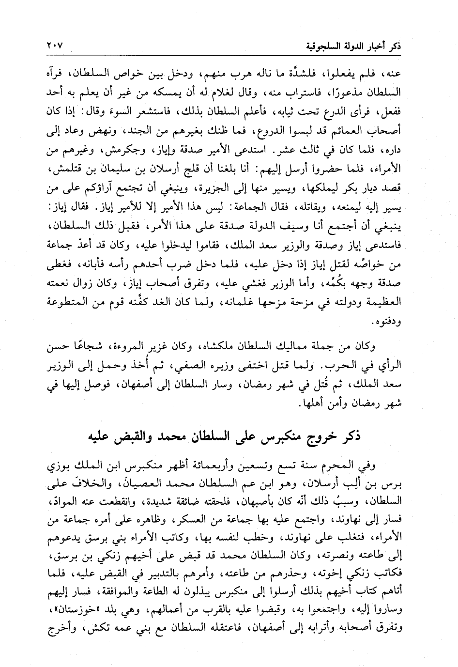 وفي المحرم سنة تسع وتسعين وأربعمائة أظهر منكبرس ابن الملك بوزي برس بن الب أرسلان ، وهو ابن عم السلطان محمد العصيان ، والخلاف على السلطان ، وسبب ذلك أنه كان بأصبهان ، فلحقته ضائقة شديدة ، وانقطعت عنه المواد ، فسار إلى نهاوند ، واجتمع عليه بها جماعة من العسكر ، وظاهره عل أمره جماعة من الأمراء ، فتغلب على نهاوند ، وخطب لنفسه بها ، وكاتب الأمراء بني برسق يدعوهم إلى طاعته ونصرته ، وكان السلطان محمد قد قبض على أخيهم زنكن بن برسق ، فكاتب زنكي إخوته ، وحذرهم من طاعته ، وأمرهم بالتدبير في القبض عليه ، فلما أتاهم كتاب أخيهم بذلك أرسلوا إلى منكبرس يبذلون له الطاعة والموافقة ، فسار إليهم وساروا غليه ، واجتمعوا به ، وقبضوا عليه بالقرب من أعمالهم ، وهي بلد خوزستان ، وتفرق أصحابه وأتوابه إلى أصفهان ، فاعتقله السلطان مع بني عمه تكش ، وأخرج