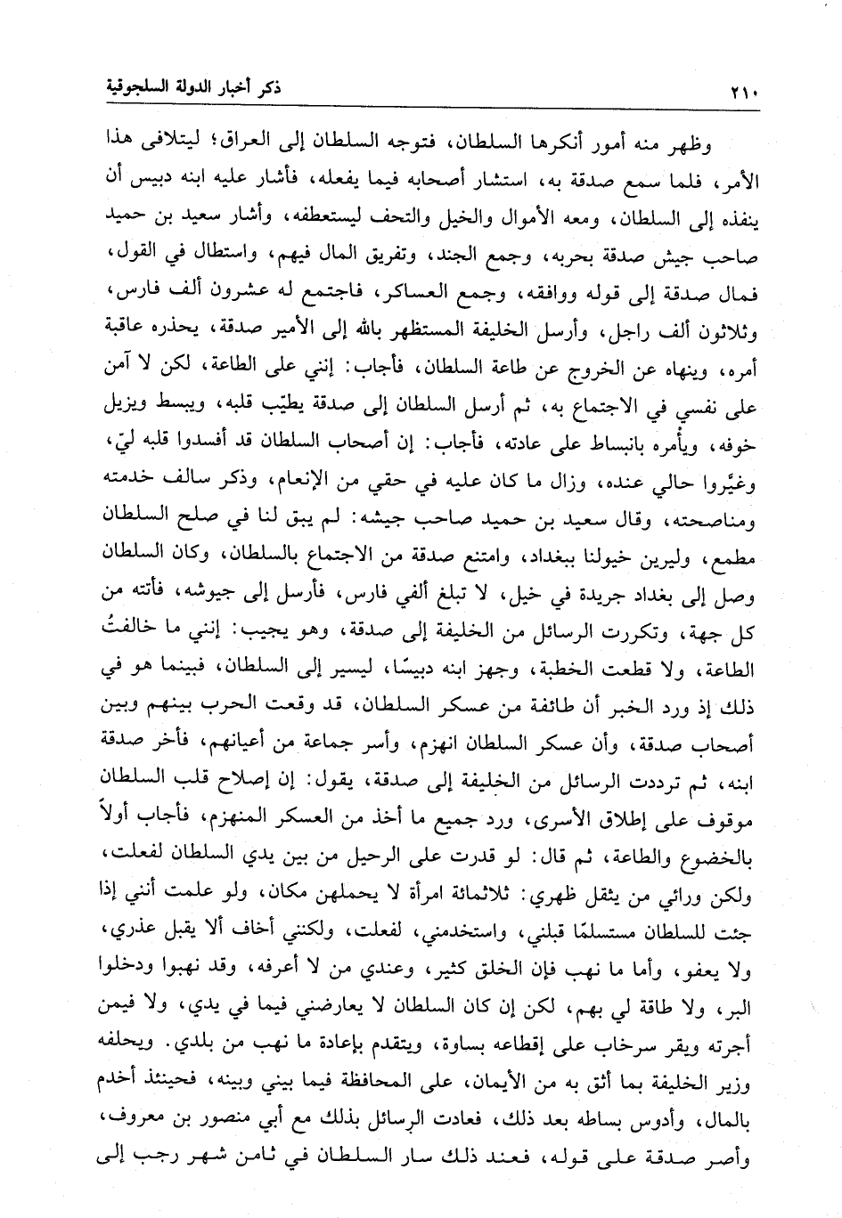 وظهر منه أمور أنكرها السلطان ، فتوجه السلطان إلى العراق ، ليتلافى هذا الأمر ، فلما سمع صدقة به ، استشار أصحابه فيما يفعله ، فأشار عليه ابنه دبيس أن ينفذه إلى السلطان ، ومعه الأموال والخيل والتحف ليستعطفه ، وأشار سعيد بن حميد صاحب جيش صدقة بحربه ، وجمع الجند ، وتفريق المال فيهم ، واستطال في القول ، فمال صدقة إلى قوله ووافقه ، وجمع العساكر ، فاجتمع له عشرون ألف فارس ، وثلاثون ألف راجل ، وأرسل الخليفة المستظهر بالله إلى الأمير صدقة ، يحذره عاقبة أمره ، وينهاه عن الخروج عن طاعة السلطان ، فأجاب : إنني على الطاعة ، لكن لا آمن على نفسي في الاجتماع به ، ثم أرسل السلطان إلى صدقة يطيب قلبه ، ويبسط ويزيل خوفه ، ويأمره بالانبساط على عادته ، فأجاب : إن أصحاب السلطان قد أفسدوا قلبه عليّ ، وغيروا حالي عنده ، وزال ما كان عليه في حقي من الإنعام ، وذكر سالف خدمته ومناصحته ، وقال سعيد بن حميد صاحب جيشه : لم يبق لنا في صلح السلطان مطمع ، وليرين خيولنا ببغداد ، وامتنع صدقة من الاجتماع بالسلطان ، وكان السلطان وصل إلى بغداد جريدة في خيل ، لا تبلغ ألفي فارس ، فأرسل إلى جيوشه ، فأتته من كل جهة ، وكررت الرسائل من الخليفة إلى صدقة ، وهو يجيب : إنني ما خالفت الطاعة ، ولا قطعت الخطبة ، وجهز ابنه دبيسا ، ليسير إلى السلطان ، فبينما هو في ذلك إذ ورد الخبر أن طائفة من عسكر السلطان ، قد وقعت الحرب بينهم وبين أصحاب صدقة ، وأن عسكر السلطان انهزم ، وأسر جماعة من أعيانهم ، فأخر صدقة ابنه ، ثم ترددت الرسائل من الخليفة إلى صدقة ، يقول : إن إصلاح قلب السلطان موقوف على إطلاق الأسرى ، ورد جميع ما اخذ من العسكر المنهزم ، فأجاب أولاً بالخضوع والطاعة ، ثم قال : لو قدرت على الرحيب من بين يدي السلطان لفعلت ، ولكن ورائي من يثقل ظهري : ثلثمائة امرأة لا يحملهن مكان ، ولو علمت أنني إذا جئت للسلطان مستسلما قبلني ، واستخدمني ، لفعلت ، ولكنني أخاف ألا يقبل عذري ، ولا يعفو ، وأما ما نهب فإن الخلق كثير ، وعندي من لا اعرفه ، وقد نهبوا ودخلوا البر ، ولا طاقة لي بهم ، لكن إن كان السلطان لا يعارضني فيما في يدي ، ولا فيمن أجرته ويقر سرخاب على إقطاعه بساوة ، ويتقدم بإعادة ما نهب من بلدي ، ويحلفه وزير الخليفة بما أثق به من الإيمان ، على المحافظة فيما بيني وبينه ، فحينئذ أخدم بالمال ، وأدوس بساطه بعد ذلك ، فعادت الرسائل بذلك مع أبي منصور بن معروف ، وأصر صدقة على قوله ، فعند ذلك سار السلطان في ثامن شهر رجب إلى