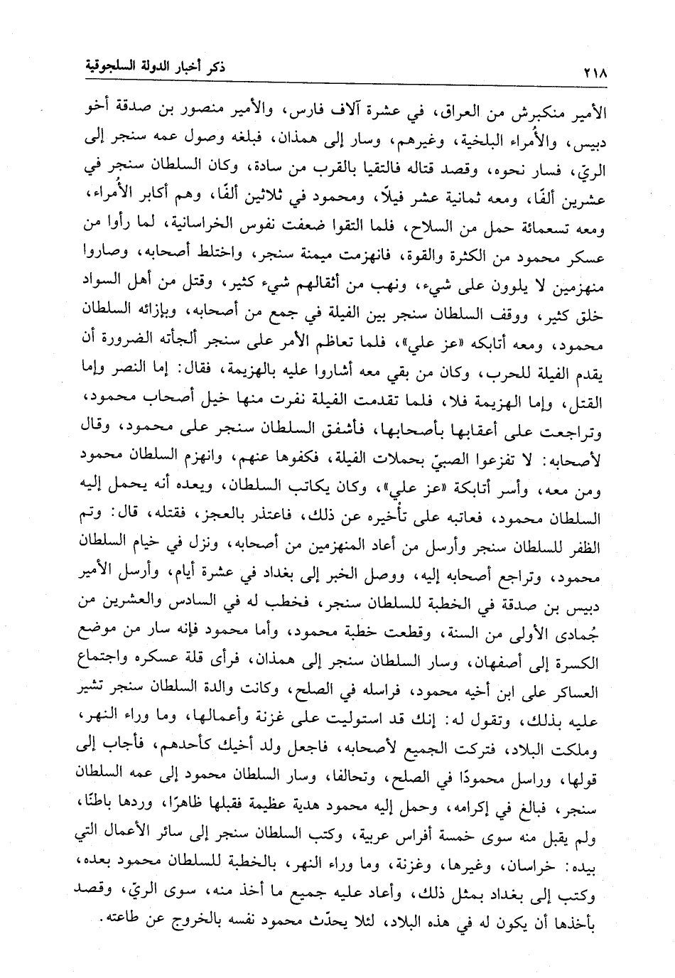 الأمير منكبرش من العراق ، في عشرة آلاف فارس ، والأمير منصور بن صدقة أخو دبيس ، والأمراء البلخية ، وغيرهم ، وسار إلى همذان ، فبلغه وصول عمه سنجر إلى الري ، فسار نحوه ، وقصد قتاله فالتقيا بالقرب من ساده ، وكأن السلطان سنجر في عشرين ألفا ، ومعه ثمانية عشر فيلا ، ومحمود في ثلاثين ألفا ، وهم أكابر الأمراء ، ومعه تسعمائة حمل من السلاح ، فلما التقوا ضعفت نفوس الخراسانة ، لما رأوا من عسكر محمود من الكثرة والقوة ، فانهزمت ميمنة سنجر ، واختلط أصحابه ، وصاروا منهزمين لا يلوون على شيء ، ونهب من أثقالهم شيء كثير ، وقتل من أهل السواد خلق كثير ، ووقف السلطان سنجر بين الفيلة في جمع من أصحابه ، وبإذائه السلطان محمود ، ومعه أتابكه عز علي ، فلما تعاظم الأمر على سنجر ألجأته الضرورة أن يقدم الفيلة للحرب ، وكان من بقي معه أشاروا عليه بالهزيمة ، فقال ، إما النصر وإما القتل ، وأما الهزيمة فلا ، فلما تقدمت الفيلة نفرت منها خيل أصحاب محمود ، وقال لصحابه : لا تفزعوا الصبي بحملات الفيلة ، فكفوها عنهم ، وانهزم السلطان محمود ومن معه ، وأسر أتابكه عز علي ، وكان يكاتب السلطان ، ويعده أنه يحمل إليه السلطان محمود ، فعاتبه على تأخيره عن ذلك ، فاعتذر بالعجز ، فقتله ، قال : وتم الظفر للسلطان وأرسل من أعاد المنهزمين من أصحابه ، ونزل في خيام السلطان محمود ، وتراجع أصحابه إليه ، ووصل الخبر إلى بغداد في عشرة أيام ، وأرسل الأمير دبيس بن صدقة في الخطبة للسلطان سنجر ، فخطب له في السادس والعشرين من جمادى الأولى من السنة ، وقطعت خطبة محمود ، وأما محمود فإنه سار من موضع الكسرة إلى أصفهان ، وسار السلطان سنجر إلى همذان ، فرأى قلة عسكره واجتماع العساكر على ابن أخيه محمود ، فراسله في الصلح وكانت والدة السلطان سنجر تشير عليه بذلك ، وتقول له : إنك قد استوليت على غزنة وأعمالها ، وما وراء النهر ، وملكت البلاد ، فتركت الجميع لأصحابه ، فاجعل ولد أخيك كأحدهم ، فأجاب إلى قولها ، وراسل محمودا في الصلح ، وتحالفا ، وسار السلطان محمود إلى عمه السلطان سنجر ، فبالغ في إكرامه ، وحمل إليه محمود هدية عظيمة فقبلها ظاهراً ، وردها باطناً ، ولم يقبل منه سوى خمسة أفراس عربية ، وكتب السلطان سنجر إلى سائر الأعمال التي بيده ، خراسان ، وغيرها ، وغزنة ، وما وراء النهر ، بالخطبة للسلطان محمود بعده ، وكتب إلى بغداد بمثل ذلك ، وأعاد عليه جميع ما أخذ منه ، سوى الري ، وقصد بأخذها أن يكون له في هذه البلاد ، لئلا يحدث محمود نفسه بالخروج عن طاعته
