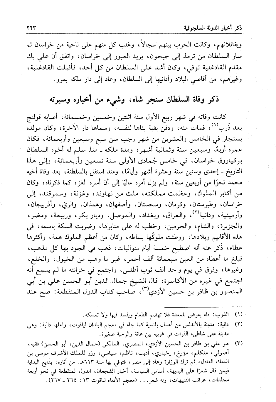 كانت وفاته في شهر ربيع الأول سنة اثنتين خمسين وخمسمائة ، أصابه قولنج بعد ذرب فمات منه ، ودفن بقبة بناها لنفسه ، وسماها دار الآخرة ، وكان مولده بسنجار في الخامس والعشرين من شهر رجب سنة سبع وسبعين وأربعمائة ، فكان عمره أربعا وسبعين سنة وثمانية اشهر ، ومدة ملكه - منذ سلم له أخوه السلطان بركياروق خراسان ، في خامس جمادى الأولى سنة تسعين وأربعمائة ، وإلى هذا التاريخ - إحدى وستين سنة وعشرة أشهر وأياما ، ومنذ استقل بالسلطنة ، بعد وفاة أخيه محمد نحوا من أربعين سنة ، ولم يزل أمره عاليا إلى أن أسره الغز ، كما ذكرناه ، وكان من أكابر الملوك ، وعظمت مملكته ، ملك من نهاوند ، وغزنة ، وسمرقند ، إلى خراسان ، وطبرستان ، وكرمان ، وسجستان ، وأصفهان ، وهمذان ، والري ، وأذربيجان ، وأرمينية ، ودانية ، والعراق ، وبغداد ، والموصل ، وديار بكر ، وربيعة ، ومضر ، والجزيرة ، والشام ، والحرمين ، وخطب له من منابرها ، وضربت السكة باسمه ، في هذه الأقاليم وبلادها ، ووطئت ملوكها بساطه ، وكان من أعظم الملوك همة ، وأكثرها عطاء ، ذكر عنه أنه اصطبح خمسة أيام متواليات ، ذهب في الجود بها كل مذهب ، فبلغ ما أعطاه من العين سبعمائة ألف أحمر ، غير ما وهب من الخيول ، والخلع ، وغيرها ، وفرق في يوم واحد ألف ثوب أطلس ، واجتمع في خزانته ما لم يسمع أنه اجتمع في غيره من الأكاسرة ، قال الشيخ جمال الدين أبو الحسن علي بن أبي المنصور ابن ظافر بن حسين الأزدي ، صاحب كتاب الدول المنقطعة : صح عند