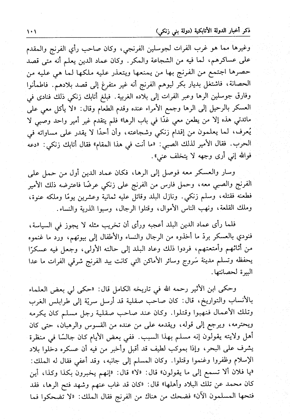 وغيرها مما هو غرب الفرات لجوسلين الفرنجي ، وكان صاحب رأي الفرنج والمقدم على عساكرهم ، لما فيه من الشجاعة والمكر . وكان عماد الدين يعمل أنه متى قصد حصرها اجتمع من الفرنج بها من يمنعها ويتعذر عليه ملكها لما هي عليه من الحصانة ، فاشتغل بديار بكر ليوهم الفرنج أنه غير متفرغ إلى قصد بلادهم . فاطمأنوا وفارق جوسلين الرها وعبر الفرات إلى بلاده الغربية . فبلغ أتابك زنكي ذلك فنادى في العسكر بالرحيل إلى الرها وجمع الأمراء عنده وقدم الطعام وقال : لا يأكل معي على مائدتي هذه إلا من يطعن معي غداً في باب الرها . فلم يتقدم غير أمير واحد وصبي لا يعرف ، لما يعلمو من إقدام زنكي وشجاعته ، وأن أحداً لا يقدر على مساواته في الحرب . فقال الأمير لذلك الصبي : ما أنت في هذا المقام فقال أتابك زنكي : دعه فوالله إني أرى وجهه لا يتخلف عني .