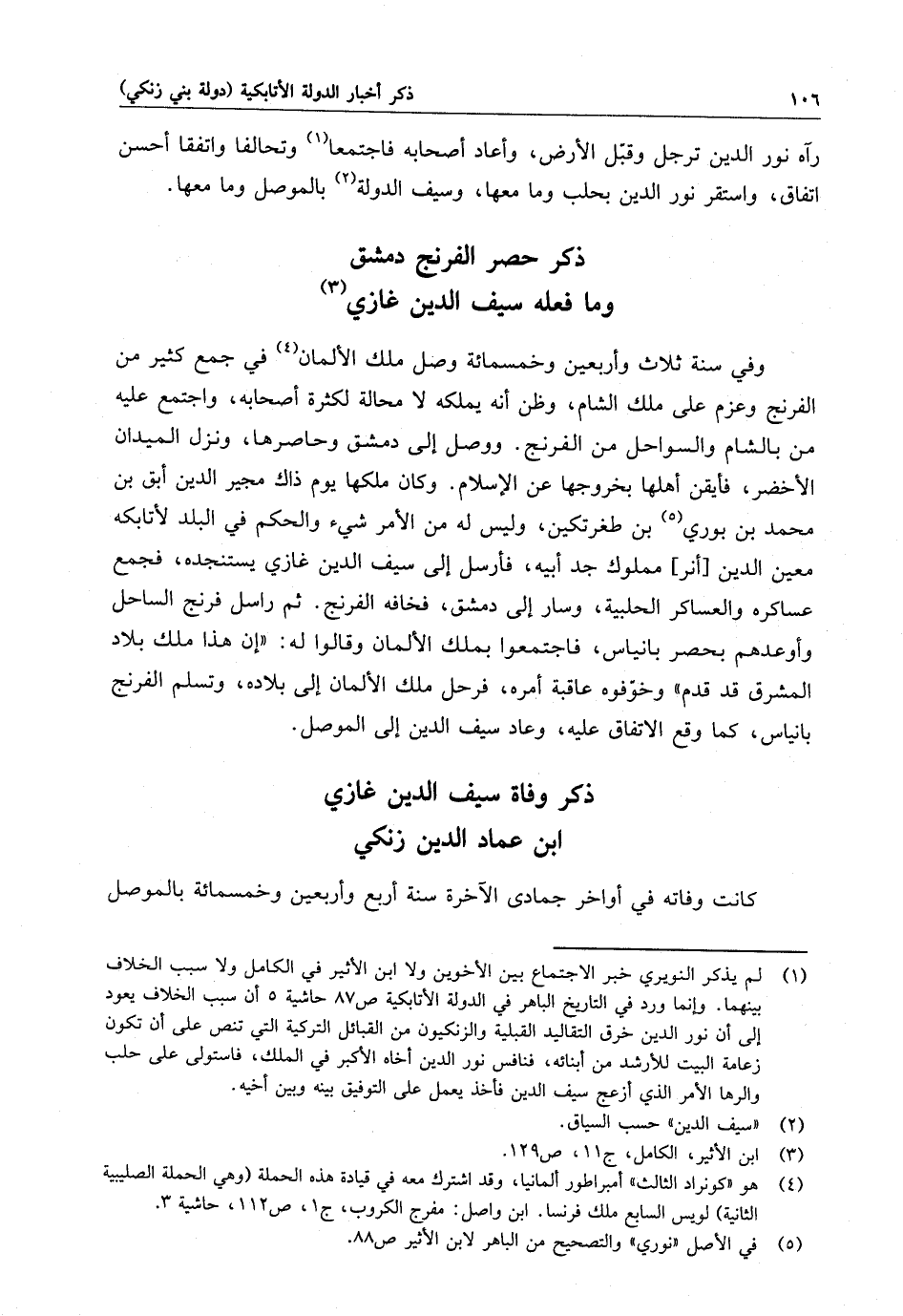 وفي سنة ثلاث وأربعين وخمسماية وصل ملك الألمان في جمع كثير من الفرنج وعزم على ملك الشام ، وظن أنه يملكه لا محالة لكثرة أصحابه ، واجتمع عليه من بالشام والسواحل من الفرنج . ووصل إلى دمشق وحاصرها ، ونزل الميدان الأخضر ، فأيقن أهلها بخروجها عن الإسلام . وكان ملكها يوم ذاك مجير الدين أبق بن محمد ابن بوري بن طغرتكين ، وليس له من الأمر شيء والحكم في البلد لأتابكه معين الدين أنر مملوك جد أبيه ، فأرسل إلى سيف الدين غازي يستنجده ، فجمع عساكره والعساكر الحلبية ، وسار إلى دمشق ، فخافه الفرنج . ثم راسل فرنج الساحل وأوعدهم بحصر بانياس ، فاجتمعوا بملك الألمان وقالوا له : إن هذا ملك بلاد المشرق قد قدم وخوفوه عاقبة أمره ، فرحل ملك الألمان إلى بلاده ، وتسلم الفرنج بانياس ، كما وقع الاتفاق عليه ، وعاد سيف الدين إلى الموصل .