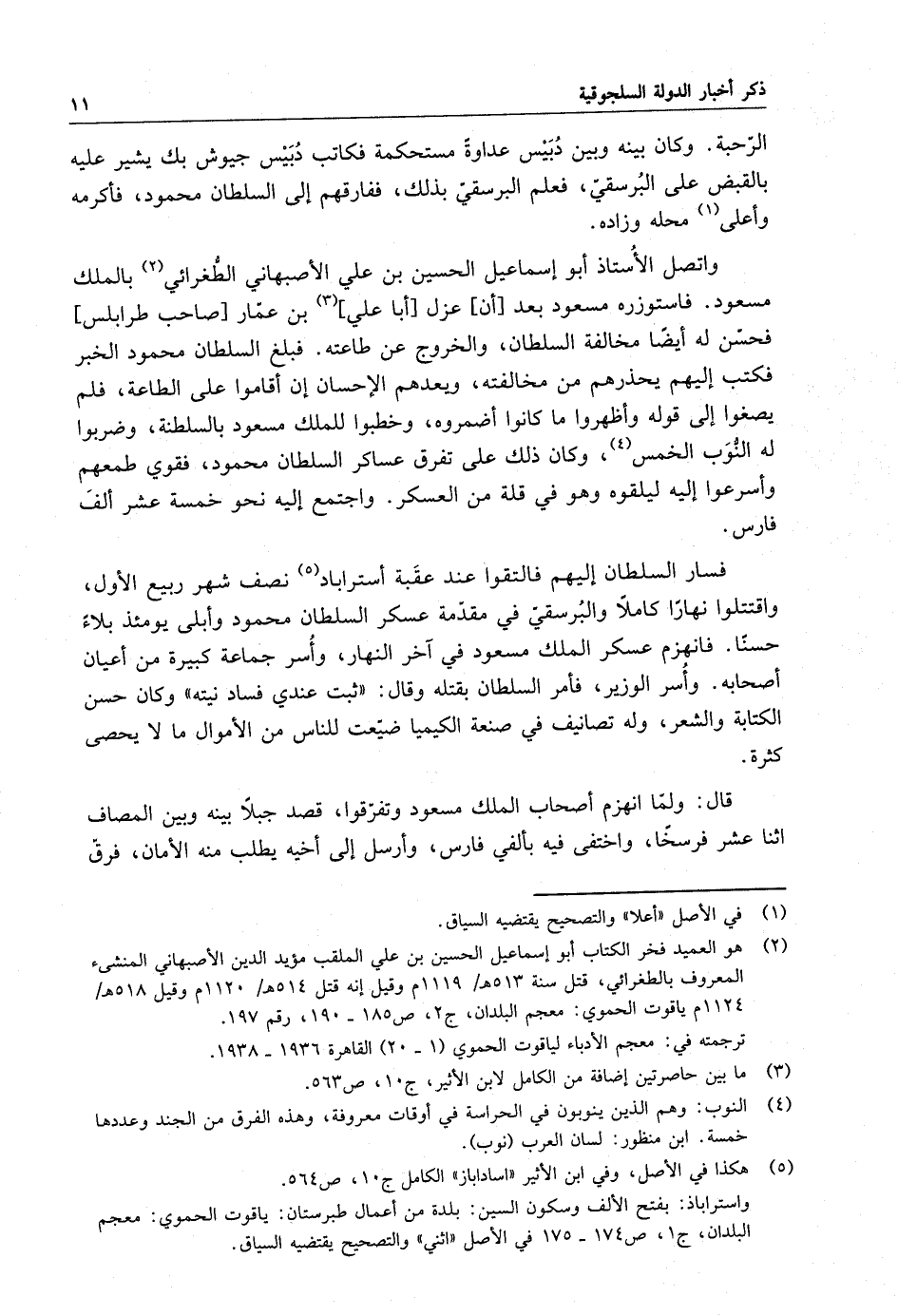 فسار السلطان إليهم فالتقوا عند عقبة استراباد نصف شهر ربيع الأول ، واقتتلوا نهاراً كاملاً والبرسقي في مقدمة عسكر السلطان محمود وأبلى يومئذ بلاء حسناً . فانهزم عسكر الملك مسعود في آخر النهار ، وأسر جماعة كبيرة من أعيان أصحابه وأسر الوزير ، فأمر السلطان بقتله وقال : ثبت عندي فساد نيته وكان حسن الكتابة والشعر ، وله تصانيف في صنعة الكيميا ضيعت للناس من الأموال مالا يحصى كثرة .