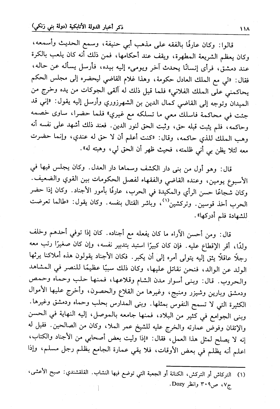 قالوا وكان عارفاً بالفقه على مذهب أبي حنيفة ، وسمع الحديث وأسمعه ، وكان يعظم الشريعة المطهرة ، ويقف عند أحكامها ، فمن ذلك أنه كان يلعب بالكرة عند دمشق ، فرأى إنساناً يحدث آخر ويومىء إليه بيده ، فأرسل يسأله عن حاله ، فقال : لي مع الملك العادل حكومة ، وهذا غلام القاضي ليحضره إلى مجلس الحكم يحاكمني على الملك الفلاني فلما قيل ذلك له ألقى الجوكات من يده وخرج من الميدان وتوجه إلى القاضي كمال الدين بن الشهرزوري وأرسل إليه يقول : إني قد جئت في محاكمة فاسلك معي ما تسلكه مع غيري . فلما حضرا ، ساوى خصمه وحاكمه ، فلم يثبت قبله حق ، وثبت الحق لنور الدين . فعند ذلك أشهد على نفسه أنه وهب الملك للذي حاكمه ، وقال : كنت أعلم أن لا حق له عندي ، وإنما حضرت معه لئلا يظن بي أن ظلمته ، فحيث ظهر أن الحق لي ، وهبته له . قال : وهو أول من بنى دار الكشف وسماها دار العدل وكان يجلس فيها في الأسبوع يومين ، وعنده القاضي والفقهاء لفصل الحكومات بين القوي والضعيف . وكان شجاعاً حسن الرأي والمكيدة في الحرب ، عارفاً بأمور الأجناد . وكان إذا حضر الحرب أخذ قوسين وتركشين ، وباشر القتال بنفسه . وكان يقول : طالما تعرضت للشهادة فلم أدركها .