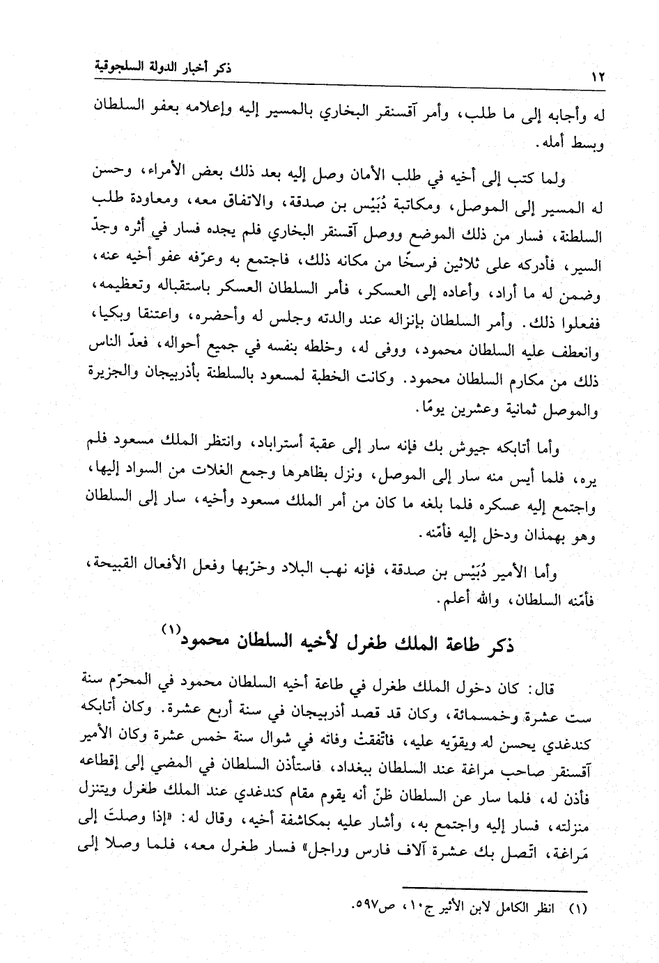 قال : كان دخول الملك طغرل في طاعة أخيه السلطان محمود في المحرم سنة ست عشرة وخمسماية ، وكان قد قصد أذربيجان في سنة أربع عشرة . وكان أتابكه كندغدي يحسن له ويقويه عليه ، فاتفقت وفاته في شوال سنة خمس عشرة وكان الأمير اقسنقر صاحب مراغة عند السلطان ببغداد ، فاستأذن السلطان في المضي إلى إقطاعه فأذن له ، فلما سار عن السلطان ظن أنه يقوم مقام كندغدي عند الملك طغرل ويتنزل منزلته ، فسار إليه واجتمع به ، وأشار عليه بمكاشفة أخيه ، وقال له : إذا وصلت إلى مراغة ، اتصل بك عشرة آلاف فارس وراجل فسار طغرل معه ، فلما وصلا إلى