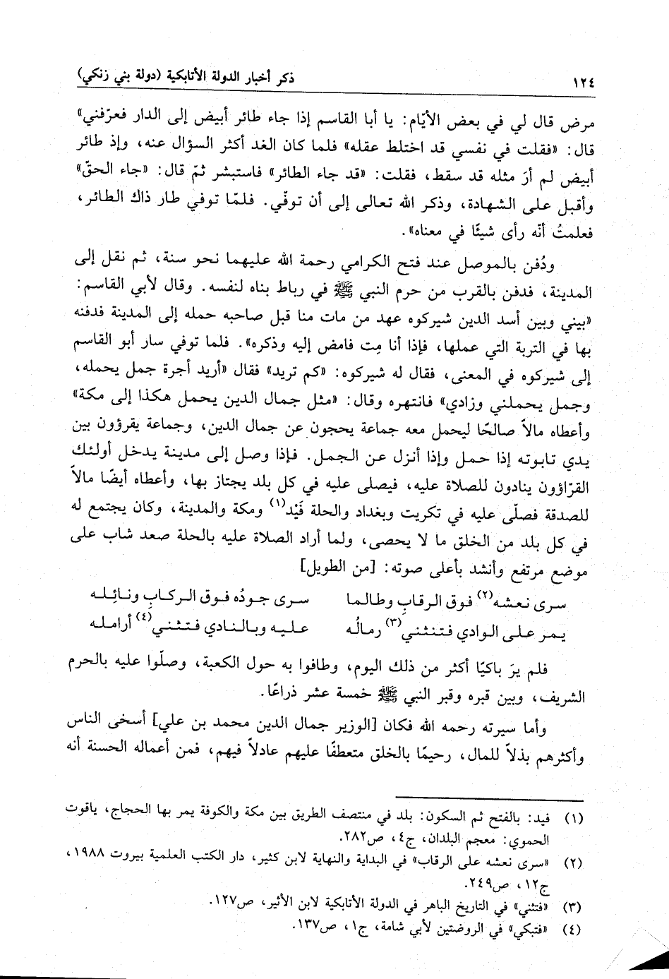 ودفن بالموصل عند فتح الكرامى رحمة الله عليهما نحو سنة ، ثم نقل إلى المدينة ، فدفن بالقرب من حرم النبي ( صلى الله عليه وسلم ) في رباط بناه لنفسه . وقال لأبي القاسم : بيني وبين أسد الدين شيركوه عهد ن مات منا قبل صاحبه حمله إلى المدينة فدفنه بها في التربة التي عملها ، فإذا أنا مت فامض إليه وذكره . فلما توفي سار أبو القاسم إلى شيركوه في المعنى ، فقال له شيركوه : كم تريد فقال أريد أجرة جمل يحمله ، وجمل يحملني وزادي فانتهره وقال : مثل جمال الدين يحمل هكذا إلى مكة وأعطاه مالا صالحاً ليحمل معه جماعة يحجون عن جمال الدين ، وجماعة يقرءون بين يدجي تابوته إذا حمل وإذا أنزل عن الجمل . فإذا وصل إلى مدينة يدخل أولئك القراءون ينادون للصلاة عليه ، فيصلى عليه في كل بلد يجتاز بها ، وأعطاه أيضاً مالا للصدقة فصلى عليه في كريت وبغداد والحلة فيد ومكة والمدينة ، وكان يجتمع له في كل بلد من الخلق ما لا يحصى ، ولما أراد الصلاة عليه بالحلة صعد شاب على موضع مرتفع وأنشد بأعلا صوته :