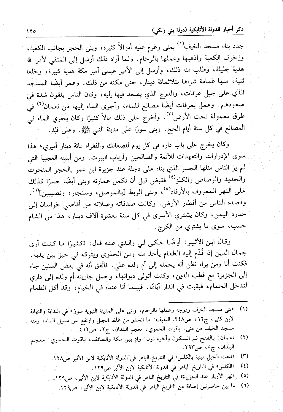 جدد بناء مسجد الخيف بمنى وغرم عليه أموالاً كثيرة ، وبنى الحجر بجانب الكعبة ، وزخرف الكعبة وأذهبها وعملها بالرخام . ولما أراد ذلك أرسل إلى المتقي لأمر الله هدية جليلة ، وطلب منه ذلك ، وأرسل إلى الأمير عيسى أمير مكة هدية كبيرة ، وخلعا ثنية ، منها عمامة شراها بثلثماية دينار ، حتى مكنه من ذلك . وعمر أيضاً المسجد الذي على جبل عرفات ، والدرج الذي يصعد فيها إليه ، وكان الناس يلقون شدة في صعودهم . وعمل بعرفات أيضاً مصانع للماء ، وأجرى الماء إليها بن نعمان في طرق معمولة تحت الأرض . وأخرج على ذلك مالاً كثيراً وكان يجري الماء في المصانع في كل سنة أيام الحج . وبنى سوراً على مدينة النبي ( صلى الله عليه وسلم ) . وعلى فيد .