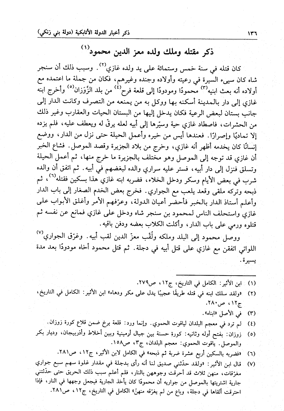 ووصل محمود إلى البلد وملك ولقب معز الذين لقب أبيه . وغرق الجواري اللواتي اتفقن مع غازي على قتل أبيه في دجلة . ثم قتل محمود أخاه مودوداً بعد مدة يسيرة .