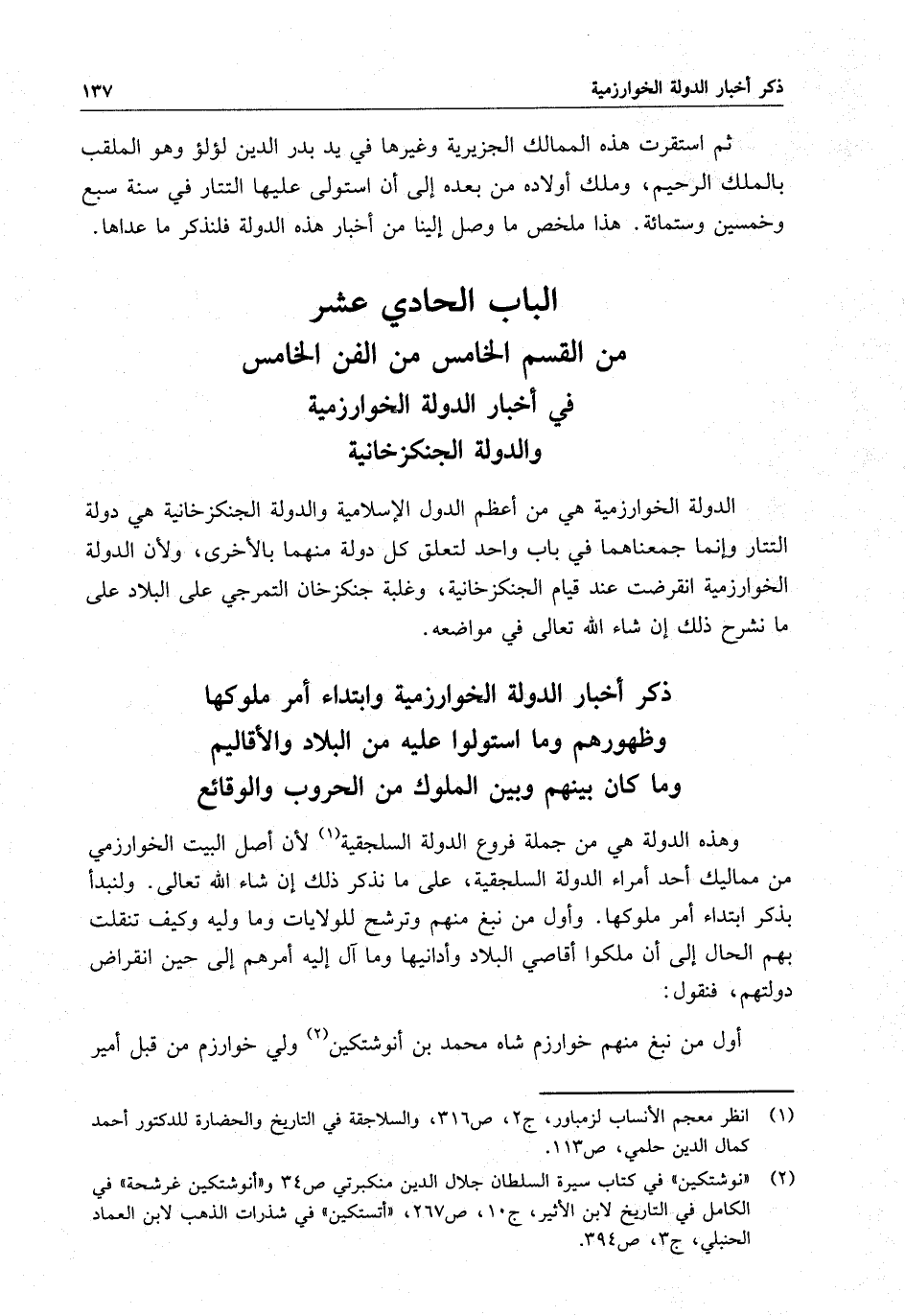 الباب الحادي عشر من القسم الخامس من الفن الخامس فب أخبار الدولة الخوارزمية والدولة الجنكزخانية