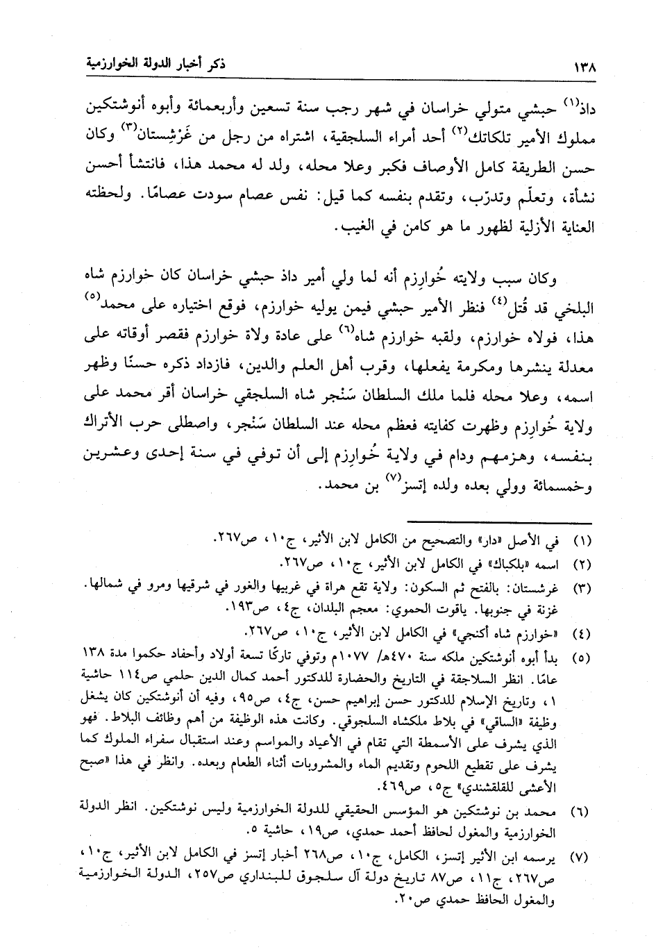 داذ حبشي متولي خراسان في شهر رجب سنة تسعين وأربعماية وأبوه انوشتكين مملوك الأمير تلكاتك أحد أمراء السلجقية ، اشتراه من رجل من غرشستان . وكان حسن الطريقة كامل الأوصاف فكبر وعلا محله ، وولد له محمد هذا ، فانتشأ أحسن نشأة ، وتعلم وتدرب ، وتقدم بنفسه كما قيل : نفس عصام سودت عصاماً . ولحظته العناية الأزلية لظهور ما هو كامن في الغيب . وكان سبب ولايته خوارزم أنه لما ولي أمير داذ حبشي خراسان كان خوارزم شاه البلخي قد قتل فنظر الأمير حبشي فيمن يوليه خوارزم ، فوقع اختياره على محمد هذا ، فولاه خوارزم ، ولقبه خوارزم شاه على عادة ولاة خوارزم فقصر أوقاته على معدلة ينشرها ومكرمة يفعلها ، وقرب أهل العلم والدين ، فازداد ذكره حسناً وظهر اسمه ، وعلا محله فلما ملك السلطان سنجر شاه السلجقي خراسان أقر محمد على ولاية خوارزم وظهرت كفايته فعظم محله عند السلطان سنجر ، واصطلى حرب الأتراك بنفسه ، وهزمهم ودام في ولاية خوارزم إلى أن توفي في سنة إحدى وعشرين وخمسمائة وولى بعده ولده اتستز بن محمد .