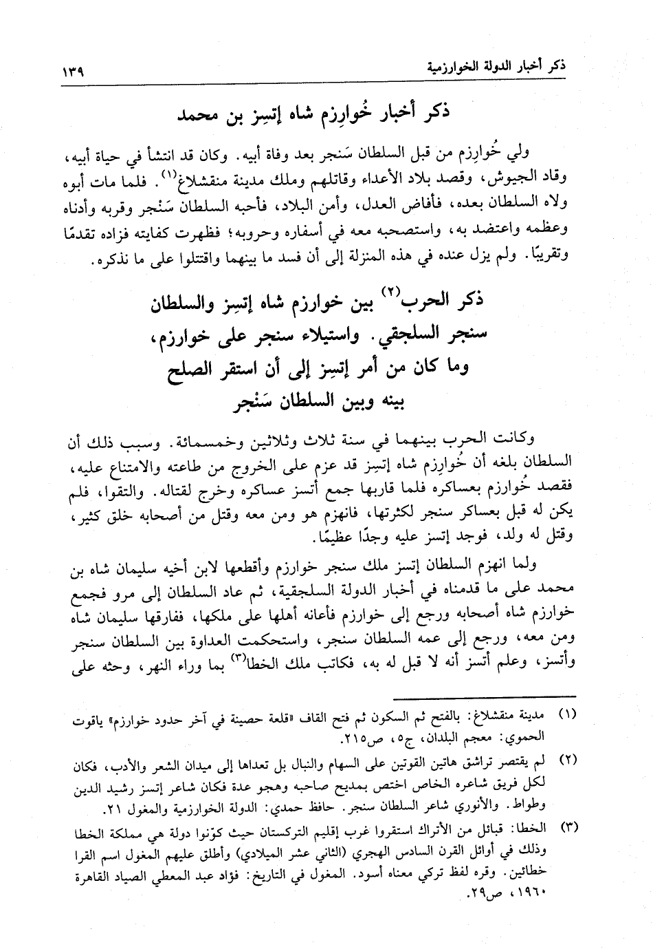 ذكر الحرب بين خوارزم شاه اتسز والسلطان سنجر السلجقي واستيلاء سنجر على خوارزم ، وما كان من أمر اتسز إلى أن استقر الصلح بينه وبين السلطان سنجر