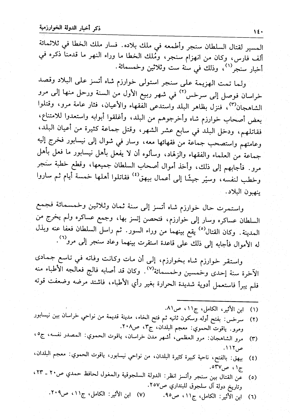 واستمرت حال خوارزم شاه أتسز إلى سنة ثمان وثلاثين وخمسماية فجمع السلطان عساكره وسار إلى خوارزم ، فتحصن أتسز بها ، وجمع عساكره ولم يخرج من المدينة . وكان القتال يقع بينهما من وراء السور . ثم راسل السلطان فعفا عنه وبذل له الأموال ، فأجابه إلى ذلك على قاعدة استقرت بينهما ، وعاد سنجر إلى مرو واستقر خوارزم شاه بخوارزم ، إلى أن مات وكانت وفاته في تاسع جمادي الآخرة سنة إحدى وخمسين وخمسماية . وكان قد أصابه فالج فعالجه الأطباء منه فلم يبرأ فاستعمل أدوية شديدة الحرارة بغير رأي الأطباء ، فاشتد مرضه وضعفت قوته