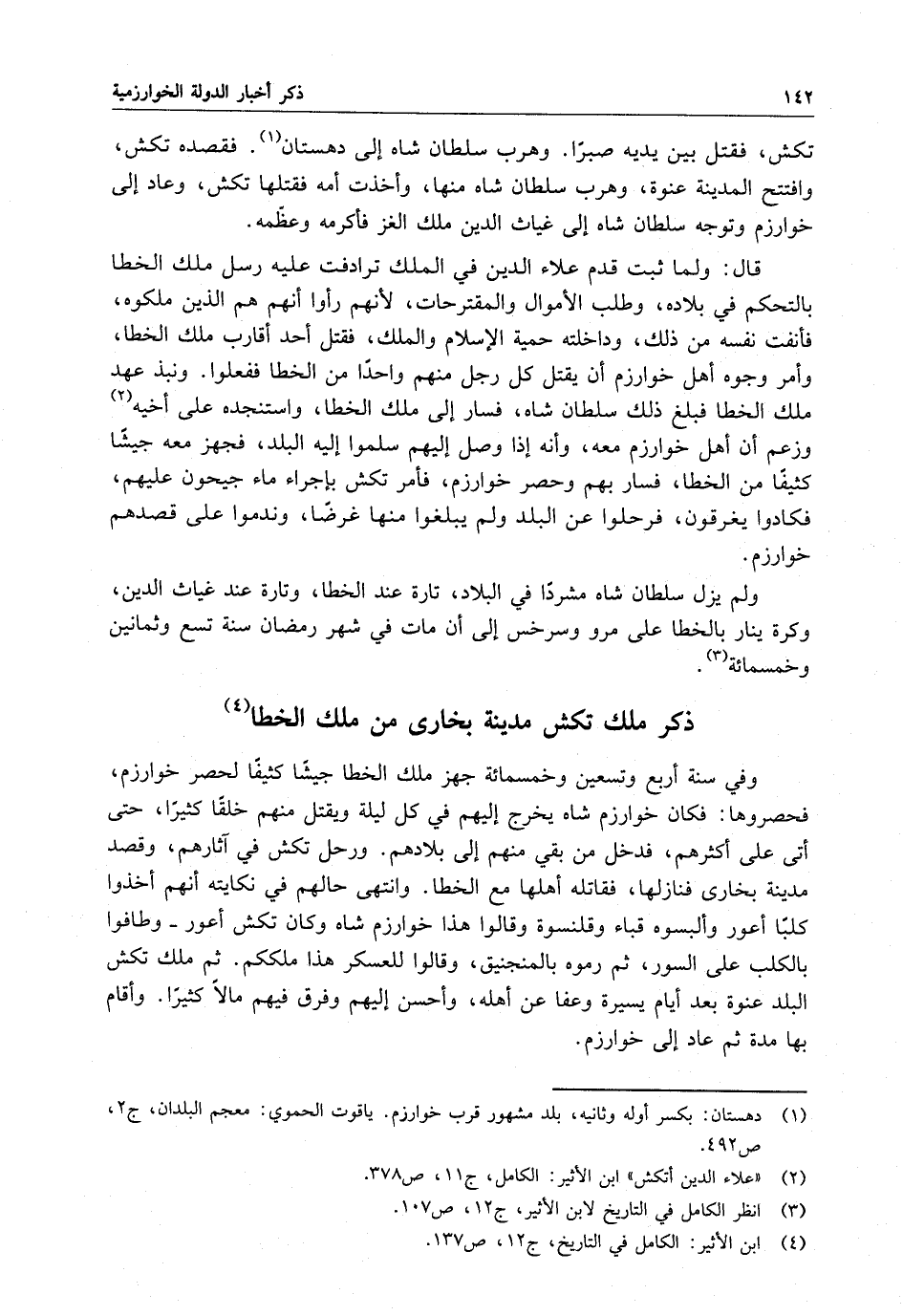 قال : ولما ثبت قدم علاء الدين في الملك ترادفت عليه رسل ملك الخطا بالتحكم في بلاده ، وطلب الأموال والمقترحات ، لأنهم رأوا أنهم هم الذين ملكوه ، فأنفت نفسه من ذلك ، وداخلته حمية الإسلام والملك ، فقتل أحد أقارب ملك الخطا ، وأمر وجوه أهل خوارزم أن يقتل كل رجل منهم واحداً من الخطا ففعلوا . ونبذ عهد ملك الخطا فبلغ ذلك سلطان شاه ، فسار إلى ملك الخطا ، واستنجده على أخيه وزعم أن أهل خوارزم معه ، وأنه إذا وصل إليهم سلموا إليه البلد ، فجهز معه جيشاً كثيفاً من الخطا ، فسار بهم وحصر خوارزم ، فأمر تكش بإجراء ماء جيحون عليهم ، فكادوا يغرقون ، فرحلوا عن البلد ولم يبلغوا منها غرضاً ، وندموا على قصدهم خوارزم .