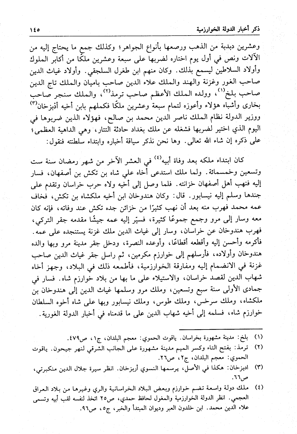 وعشرين دبدبة من الذهب ورصعها بأنوا الجواهر ؛ وكذلك جمع ما يحتاج إليه من الآلات . ونص في أول يوم اختاره لضربها على سبعة وعشرين ملكاً من أكابر الملوك وأولاد السلاطين ليسمع بذلك . وكان منهم ابن طغرل السلجقي ، وأولاد غياث الدين صاحب الغور وغزنة والهند ، والملك علاء الدين صاحب باميان والملك تاج الدين صاحب بلخ ، وولده الملك الأعظم صاحب ترمذ ، والملك سنجر صاحب بخارى ، وأشباه هؤلاء وأعوزه لتمام سبعة وعشرين ملكاً فكملهم بابن أخيه أدبزخان ، ووزير الدولة نظام الملك ناصر الدين محمد بن صالح ، فهؤلاء الذين ضربوها في اليوم الذي اختير لضربها فشغله عن ملك بغداد حادثة التتار ، وهي الداهية العظمى ؛ على ما نذكره إن شاء الله تعالى . وها نحن نذكر سياقه أخباره وابتداء سلطنته فنقول : كان ابتداء ملكه بعد وفاة أبيه في العشر الآخر من شهر رمضان سنة ست وتسعين وخمسماية . ولما ملك استدعى أخاه على شاه ابن تكش من أصفهان ، فسار إليه فنهب أهل أصفهان خزانته . فلما وصل إلى أخيه ولاه حرب خراسان والتقدم على جندها وسلم إليه نيسابور . قال وكان هندوخان ابن أخيه ملكشاه بن تكش ، فخاف عمه محمد فهرب منه بعد أن نهب كثيراً من خزائن جده تكش عند وفاته ، فإنه كان معه وسار إلى مرو وجمع جموعاً كثيرة ، فسير إليه عمه جيشاً مقدمه جقر التركي ، فهرب هندوخان عن خراسان ، وسار إلى غياث الدين ملك غزنة يستنجده على عمه . فأكرمه وأحسن إليه وأقطعه أقطاعاً ، وأوعده النصرة ، ودخل جقر مدينة مرو وبها والده هندوخان وأولاده ، فأرسلهم ، إلى خوارزم مكرمين ، ثم راسل جقر غياث الدين صاحب غزنة في الانضمام إليه ومفارقة الخوارزمية ، فأطعمه ذلك في البلاد ، وجهز أخاه شهاب الدين لقصد خراسان ، والاستيلاء على ما بها من بلاد خوارزم شاه . فسار في جمادي الأولى سنة سبع وتسعين ، وملك مرو وسلمها غياث الدين إلى هندوخان بن ملكشاه ، وملك سرخس ، وملك طوس ، وملك نيسابور وبها على شاه أخو السلطان خوارزم شاه ، فسلمه إلى أخيه شهاب الدين على ما قدمناه في أخبار الدولة الغورية .