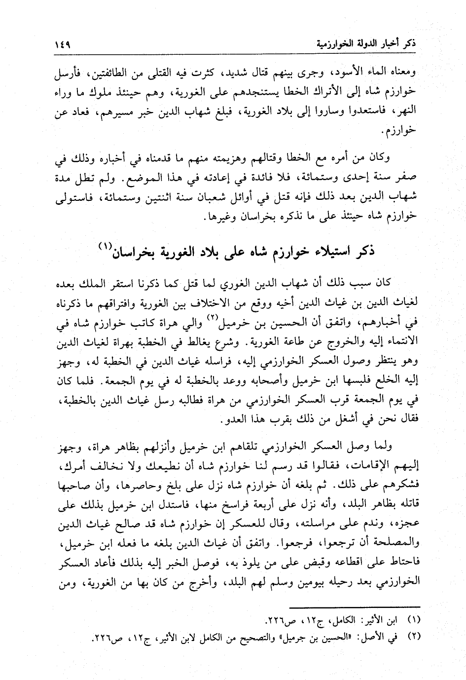 ولما وصل العسكر الخوارزمي تلقاهم ابن خرميل وأنزلهم بظاهر هراة ، وجهز إليهم الإقامات ، فقالوا قد رسم لنا خوارزم شاه أن نطيعك ولا نخالف أمرك ، فشكرهم على ذلك . ثم بلغه أن خوارزم شاه نزل على بلخ وحاصرها ، وأن صاحبها قاتله بظاهر البلد ، وأنه نزل على أربعة فراسخ منها ، فاستدل ابن خرميل بذلك على عجزه ، وندم على مراسلته ، وقال للعسكر إن خوارزم شاه قد صالح غياث الدين والمصلحة أن ترجعوا ، فرجعوا . واتفق أن غياث الدين بلغه ما فعله ابن خرميل ، فاحتاط على إقطاعه وقبض على من يلوذ به ، فوصل الخبر إليه بذلك فأعاد العسكر الخوارزمي بعد رحيله بيومين وسلم لهم البلد ، وأخرج من كان بها من العورية ، ومن
