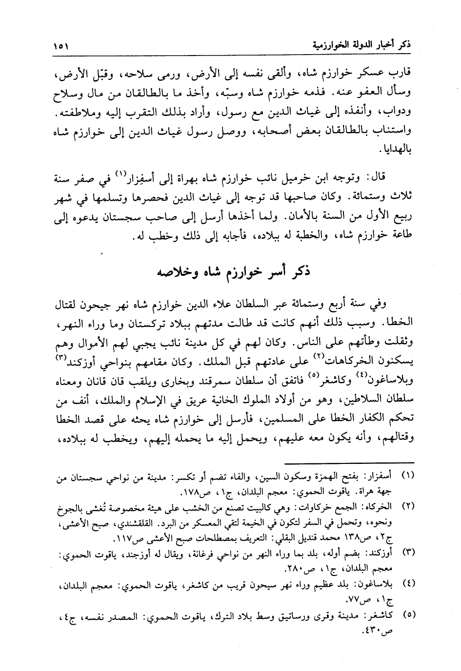 قال : وتوجه ابن خرميل نائب خوارزم شاه بهراة إلى اسفزار في صفر سنة ثلاث وستماية . وكان صاحبها قد توجه إلى غياث الدين فحصرها وتسلمها في شهر ربيع الأول من السنة بالأمان . ولما أخذها أرسل إلى صاحب سجستان يدعوه إلى طاعة خوارزم شاه ، والخطبة له ببلاده ، فأجابه إلى ذلك وخطب له .