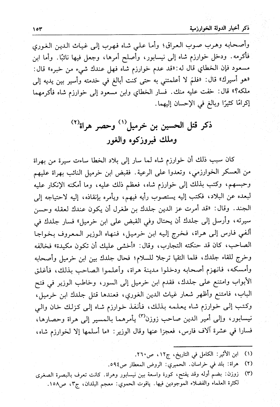 كان سبب ذلك أن خوارزم شاه لما سار إلى بلاد الخطا ساءت سيرة من بهراة من العسكر الخوارزمي ، وتعدوا على الرعية . فقبض ابن خرميل النايب بهراة عليهم وحبسهم ، وكتب بذلك إلى خوارزم شاه ، فعظم ذلك عليه ، وما أمكنه الإنكار عليه لبعده عن البلاد ، فكتب إليه يستصوب رأيه فيهم ، ويأمره بإنقاذه ، إليه لاحتياجه إلى الجند . وقال : قد أمرت عز الدين جلدك بن طغرل أن يكون عندك لعقله وحسن سيرته ، وأرسل إلى جلدك أن يحتال وفي القبض على ابن خرميل فسار جلدك في ألفي فارس إلى هراه ، فخرج إليه ابن خرميل ، فنهاه الوزير المعروف بخواجا الصاحب ، كان قد حنكته التجارب ، وقال : أخشى عليك أن تكون مكيدة فخالفه وخرج للقاء جلدك ، فلما التقيا ترجلا للسلام ؛ فحال جلدك بين ابن خرميل وأصحابه وأمسكه ، فانهزم أصحابه ودخلوا مدينة هراة ، وأعلموا الصاحب بذلك ، فأغلق الأبواب وامتنع على جلدك ، فقدم ابن خرميل إلى السور ، وخاطب الوزير في فتح الباب ، فامتنع وأظهر شعار غياث الدين الغوري ، فعندها قتل جلدك ابن خرميل ، وكتب إلى خوارزم شاه يعلمه بذلك ، فأنفذ خوارزم شاه إلى كزلك خان وإلى نيسابور ، وإلى أمير الدين صاحب زوزن يأمرهما بالمسيرة إلى هراة وحصارها ، فسارا في عشرة آلاف فارس ، فعجزا عنها وقال الوزير : ما أسلمها إلا لخوارزم شاه ،