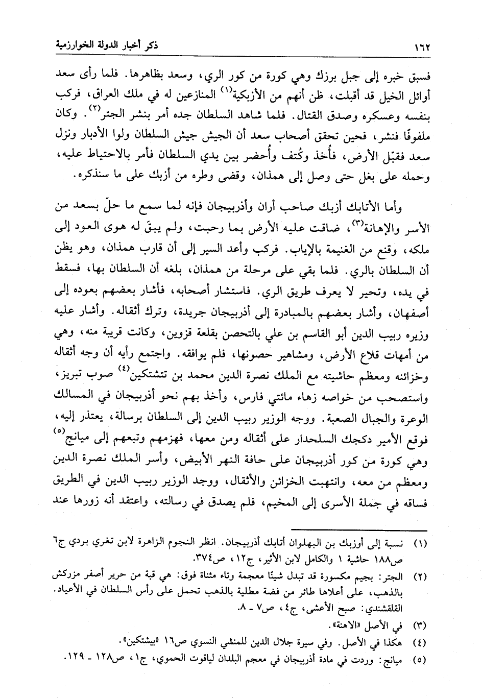 فسبق خبره إلى جبل برزك وهي كورة من كور الري ، وسعد بظاهرها . فلما رأى سعد أوائل الخيل قد أقبلت ، ظن أنهم من الأزبكية المنازعين له في ملك العراق ، فركب بنفسه وعسكره وصدق القتال . فلما شاهد السلطان جده أمر بنشر الجتر . وكان ملفوفا فنشر ، فحين تحقق أصحاب سعد أن الجيش جيش السلطان ولوا الأدبار ونزل سعد فقبل الأرض ، فأخذ وكتف وأحضر بين يدي السلطان فأمر بالاحتياط عليه ، وحمله على بعل حتى وصل إلى همذان ، وقضى وطره من أزبك على ما سنذكره . وأما الأتابك أزبك صاحب أران وأذربيجان فإنه لما سمع ما حل بسعد من الأسر والإهانة ، ضاقت عليه الأرض بما رحبت ، ولم يبق له هوى العود إلى ملكه ، وقنع من الغنيمة بالإياب . فركب وأعد السير إلى أن قارب همذان ، وهو يظن أن السلطان بالري . فلما بقي على مرحلة من همذان ، بلغه أن السلطان بها ، فسقط في يده ، وتحير لا يعرف طريق الري . فاستشار أصحابه ، فأشار بعضهم بعوده إلى أصفهان ، وأشر بعضهم بالمبادرة إلى أذربيجان جريدة ، وترك أقاله . وأشار عليه وزيره ربيب الدين أبو القاسم بن علي بالتحصن بقلعة قزوين ، وكانت قريبة منه ، وهي من أمهات قلاع الأرض ، ومشاهير حصونها ، فلم يوافقه . واجتمع رأيه أن وجه أثقاله وخزائنه وبعض حاشيته مع الملك نصرة الدين محمد بن تتشتكين صوب تبريز ، واستصحب من خواصه زهاء مائتي فارس ، وأخذ بهم نحو أذربيجان في المسالك الوعرة والجبال الصعبة . ووجه الوزير ربيب الدين إلى السلطان برسالة ، يعتذر إليه ، فوقع الأمير دكجك السلحدار على أثقاله ومن معا ، فهزمهم وتبعهم إلى ميانج وهي كورة من كور أذربيجان على حافة النهر الأبيض ، وأسر الملك نصرة الدين ومعظم من معه ، وانتهبت الخزائن والأثقال ، ووجد الوزير ربيب الدين في الطريق فساقه في جملة الأسرى إلى المخيم ، فلم يصدق في رسالته ، واعتقد أنه زورها عند