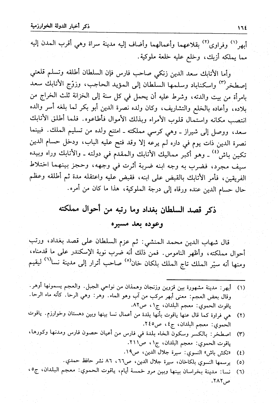 أبهر وفراوي بقلاعهما وأعمالهما وأضاف إليه مدينة سراة وهي أقرب المدن إليه مما يملكه أزبك ، وخلع عليه خلعة ملوكية . وأما الأتابك سعد الدين زنكي صاحب فارس فإن السلطان أطلقه وتسلم قلعتي اصطخر واسكناباد وسلمها السلطان إلى المؤيد الحاجب ، وزوج الأتابك سعد بامرأة من بيت والدته ، وشرط عليه أن يحمل في كل سنة إلى الخزانة ثلث الخراج من بلاده ، وأعاده بالخلع والتشاريف ، وكان ولده نصرة الدين أبو بكر لما بلغه أسر والده انتصب مكانه واستمال قلوب الأمراء وبذل الأموال فأطاعوه . فلما أطلق الأتابك سعد ، ووصل إلى شيراز - وهي كرسي مملكته - امتنع ولده من تسليم الملك . فبينما نصرة الدين ذات يوم في داره لم يرعه إلا وقد فتح عليه الباب ، ودخل حسام الدين تكين باش - وهو أكبر مماليك الأتابك والمقدم في دولته - والأتابك وراه وبيده سيف مجرد ، فضرب به وجه ابنه ضربة أثرت في وجهه ، وحجز بينهما اختلاط الفريقين ، فأمر الأتابك بالقبض على ابنه ، فقبض عليه واعتقله مدة ثم أطلقه وعظم حال حسام الدين عنده ورقاه إلى درجة الملوكية ، هذا ما كان من أمره .