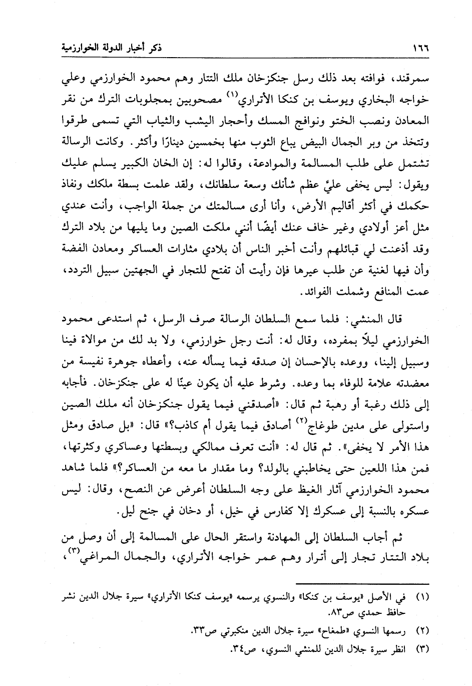 سمرقند ، فوافته بعد ذلك رسل جنكزخان ملك التتار وهم محمود الخوارزمي وعلى خواجه البخاري ويوسف بن كنكا الأتراري مصحوبين بمجلوبات الترك من نقر المعادن ونصب الختو ونوافج المسك وأحجار اليشب والثياب التي تسمى طرقوا وتتخذ من وبر الجمال البيض يباع الثوب منها بخمسين دينارا وأكثر . وكانت الرسالة تشتمل على طلب المسالمة والموادعة ، وقالوا له : إن الخان الكبير يسلم عليك ويقول : ليس يخفي علي عظم شأنك وسعة سلطانك ، ولقد علمت بسطة ملكك ونفاذ حكمك في أكثر أقاليم الأرض ، وأنا أرى مسالمتك من جملة الواجب ، وأنت عندي مثل أعز أولادي وغير خاف عنك أيضا أنني ملكت الصين وما يليها من بلاد الترك وقد أذعنت لي قبايلهم وأنت أخبر الناس أن بلادي مثارات العساكر ومعادن الفضة وأن فيها لغنية عن طلب غيرها فإن رأيت أن تفتح للتجار في الجهتين سبيل التردد ، عمت المنافع وشملت الفوائد . قال المنشي : فلما سمع السلطان الرسالة صرف الرسل ، ثم استدعى محمود الخوارزمي ليلا بمفرده ، وقال له : أنت رجل خوارزمي ، ولا بد لك من موالاة فينا وسبيل إلينا ، ووعده بالإحسان إن صدقه فيما يسأله عنه ، وأعطاه جوهرة نفيسة من معضدته علامة للوفاء بما وعده ، وشرط عليه أن يكون عينا له على جنكزخان . فأجابه إلى ذلك رغبة أو رهبة ثم قال : أصدقني فيما يقول جنكزخان أنه ملك الصين واستولى على مدينة طوغاج أصادق فيما يقول أو كاذب ؟ قال : بل صادق ومثل هذا الأمر لا يخفى ثم قال له : أنت تعرف ممالكي وبسطتها وعساكري وكثرتها ، فمن هذا اللعين حتى يخاطبني بالولد ؟ وما مقدار ما معه من العساكر ؟ فلما شاهد محمود الخوارزمي آثار الغيظ على وجه السلطان أعرض عن النصح ، وقال : ليس عسكره بالنسبة إلى عسكرك إلا كفارس في خيل ، أودخان في جنح ليل .