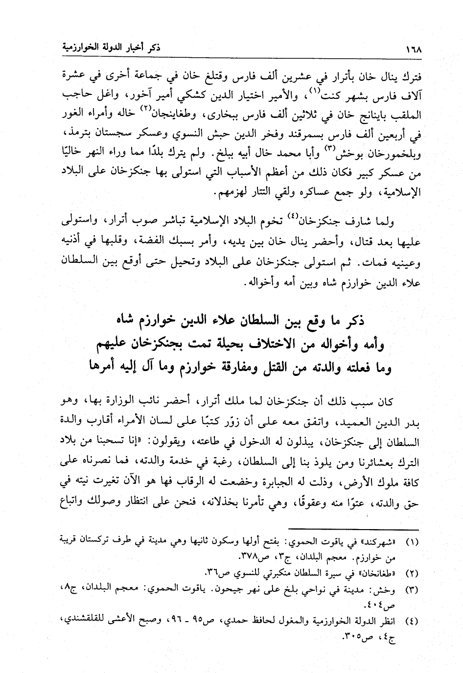 ذكر ما وقع بين السلطان علاء الدين خوارزم شاه وأمه وأخواله من الاختلاف بحيلة تمت بجنكزخان عليهم وما فعلته والدته من القتل ومفارقة خوارزم وما آل إليه أمرها