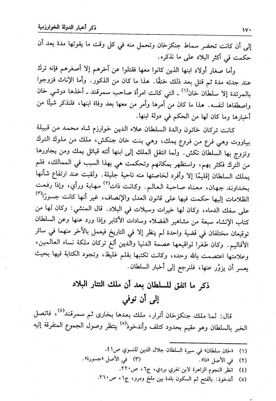 قال : لما ملك جنكزخان أترار ، ملك بعدها بخارى ثم سمرقند ، فاتصل الخبر بالسلطان وهو مقيم بحدود كتلف وأندخوذ ينتظر وصول الجموع المتفرقة إليه